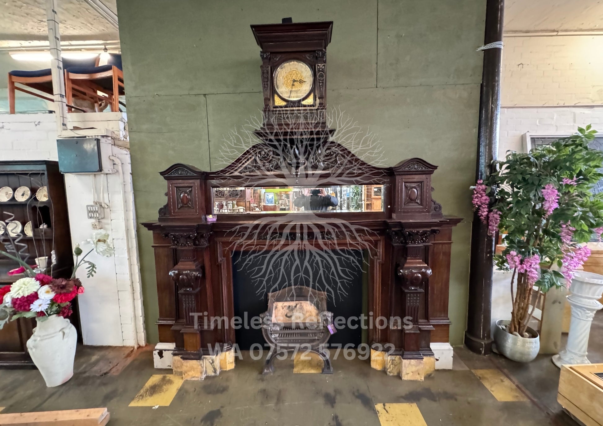 Antique Carved Wooden Fireplace with ‘Tempus Fugit’ Clock