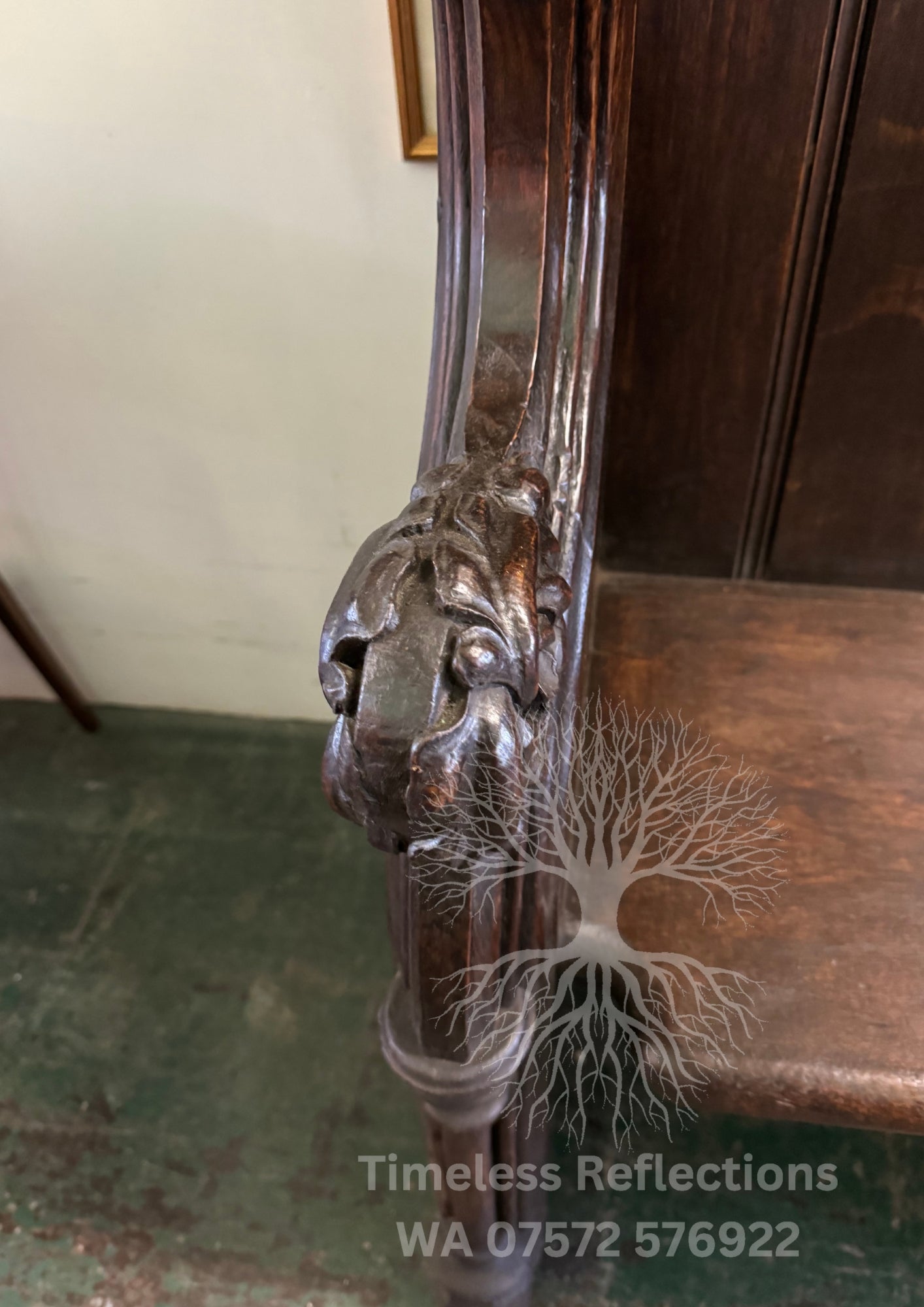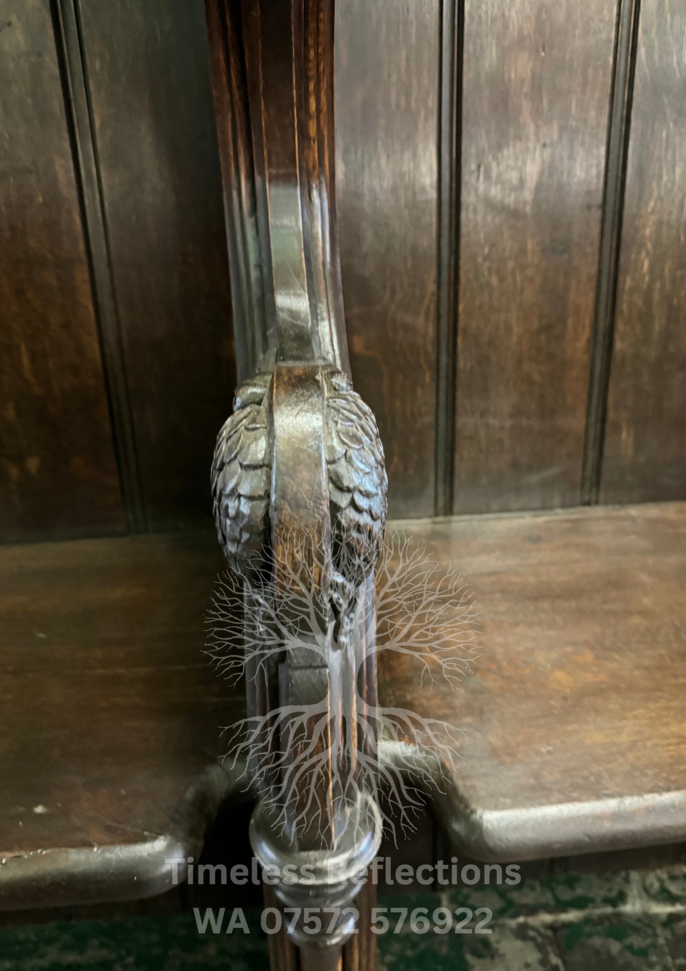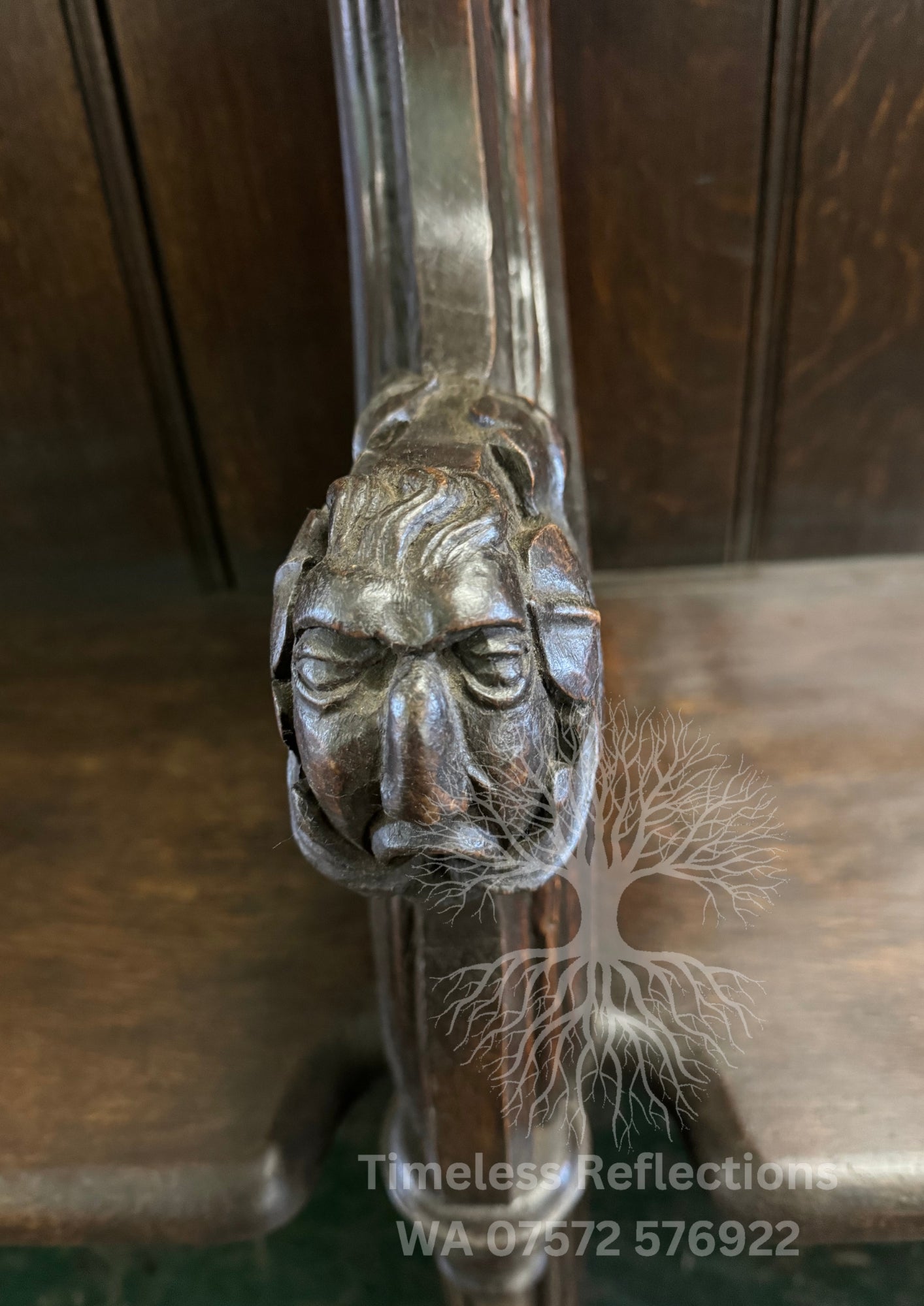 This striking Antique Oak Church Pew is a beautiful example of craftsmanship, featuring intricate carvings that bring character and charm to its solid oak frame. The gracefully curved armrests are adorned with finely detailed carvings, including striking lion-head motifs, adding a majestic and almost Gothic feel to the overall design.