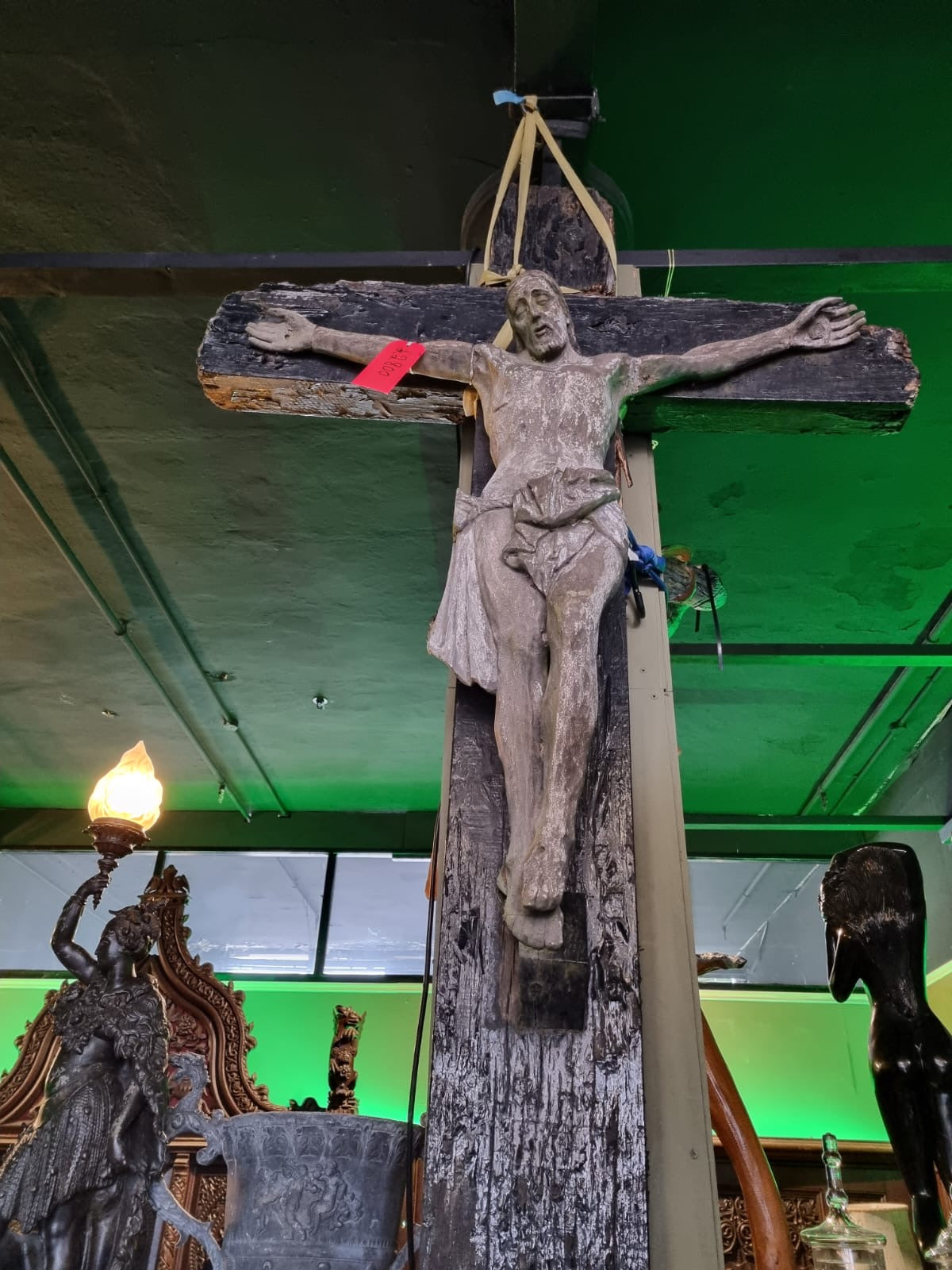 The cross, with its rich grain and aged patina, adds an element of timelessness, making this a perfect centrepiece for any spiritual or historical collection. The craftsmanship not only reflects devotion but also a masterful handling of wood, making this piece a rare find for connoisseurs of religious artefacts.