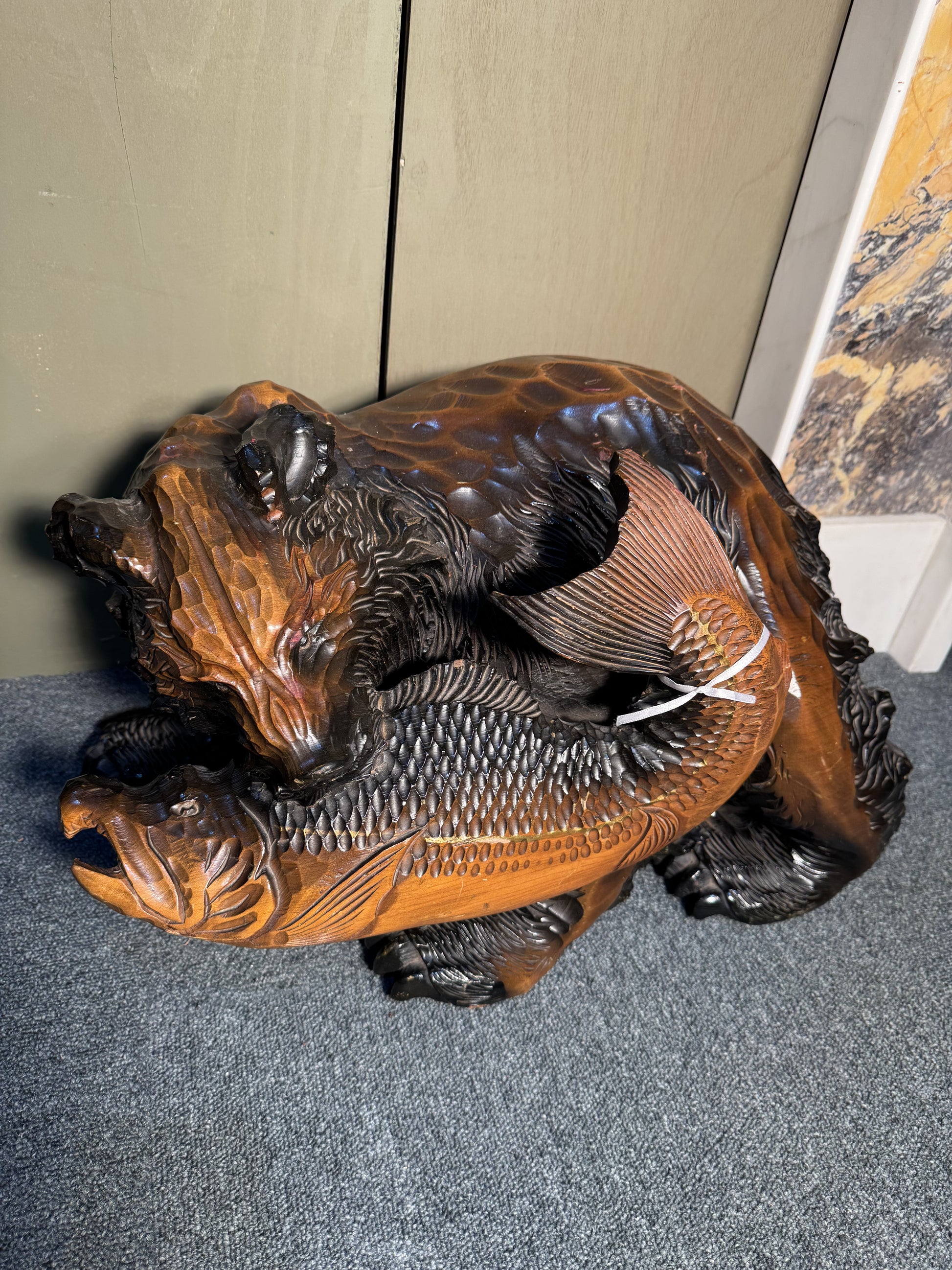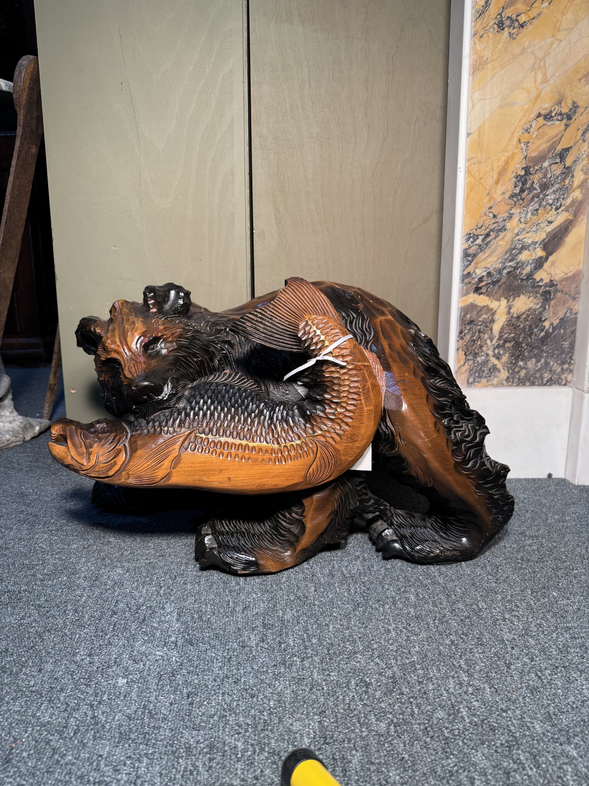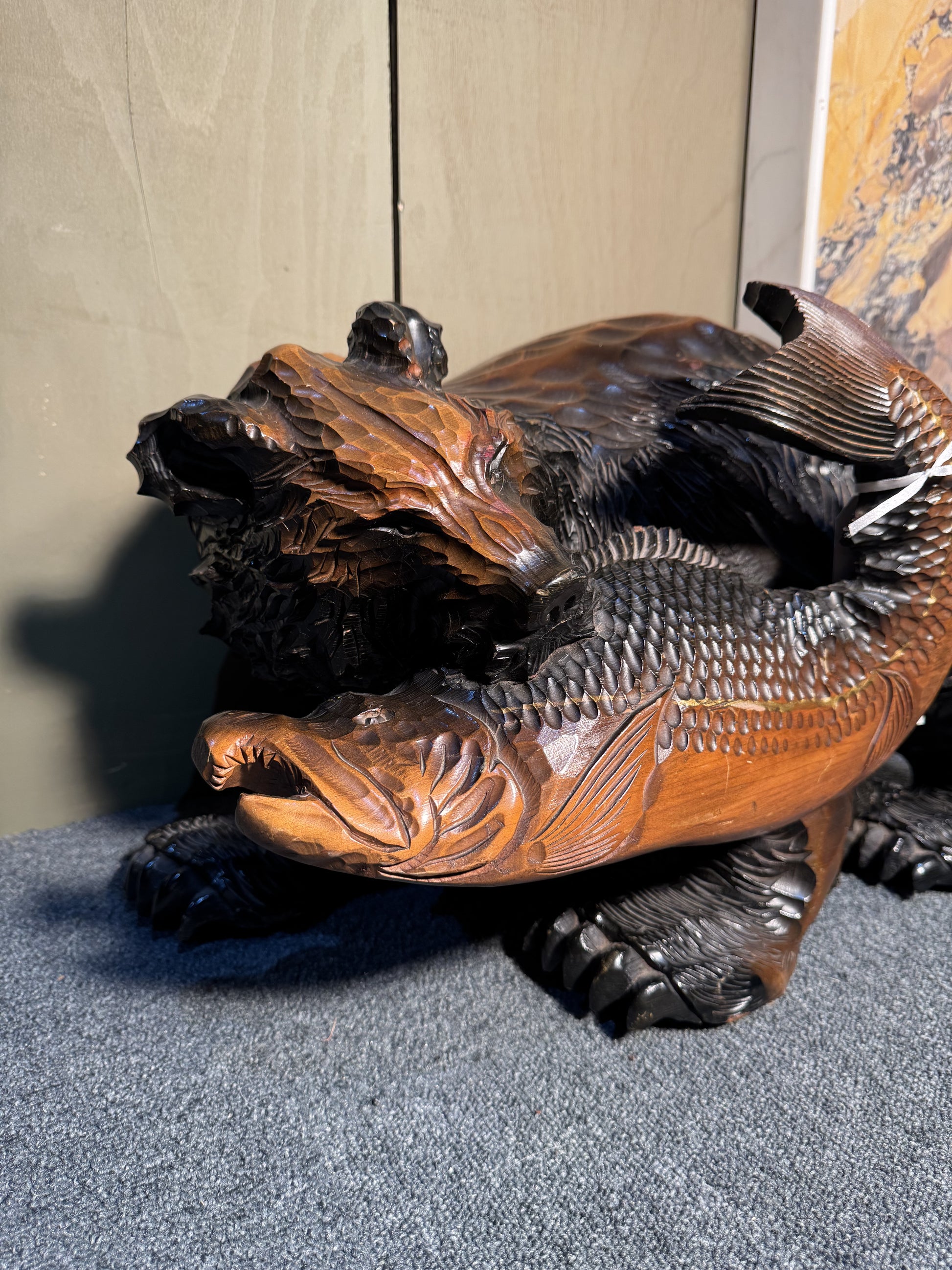 Introducing the Black Forest Bear sculpture, a masterful piece of wood carving artistry. This striking sculpture captures a bear in a dynamic pose, intricately detailed to showcase its fur texture and muscular form. The bear is depicted holding a large fish, adding a narrative element to the piece that evokes scenes of nature and wildlife.