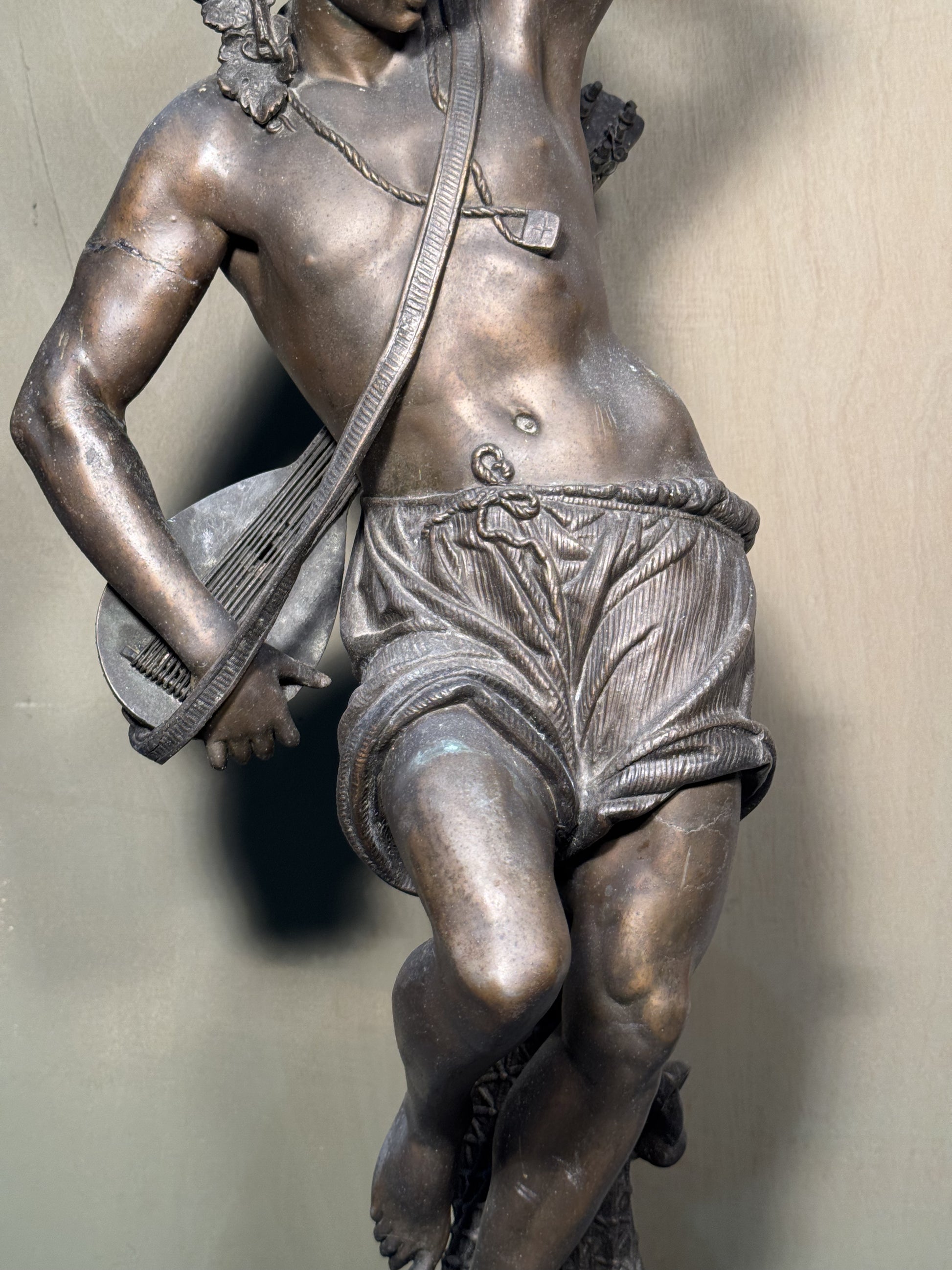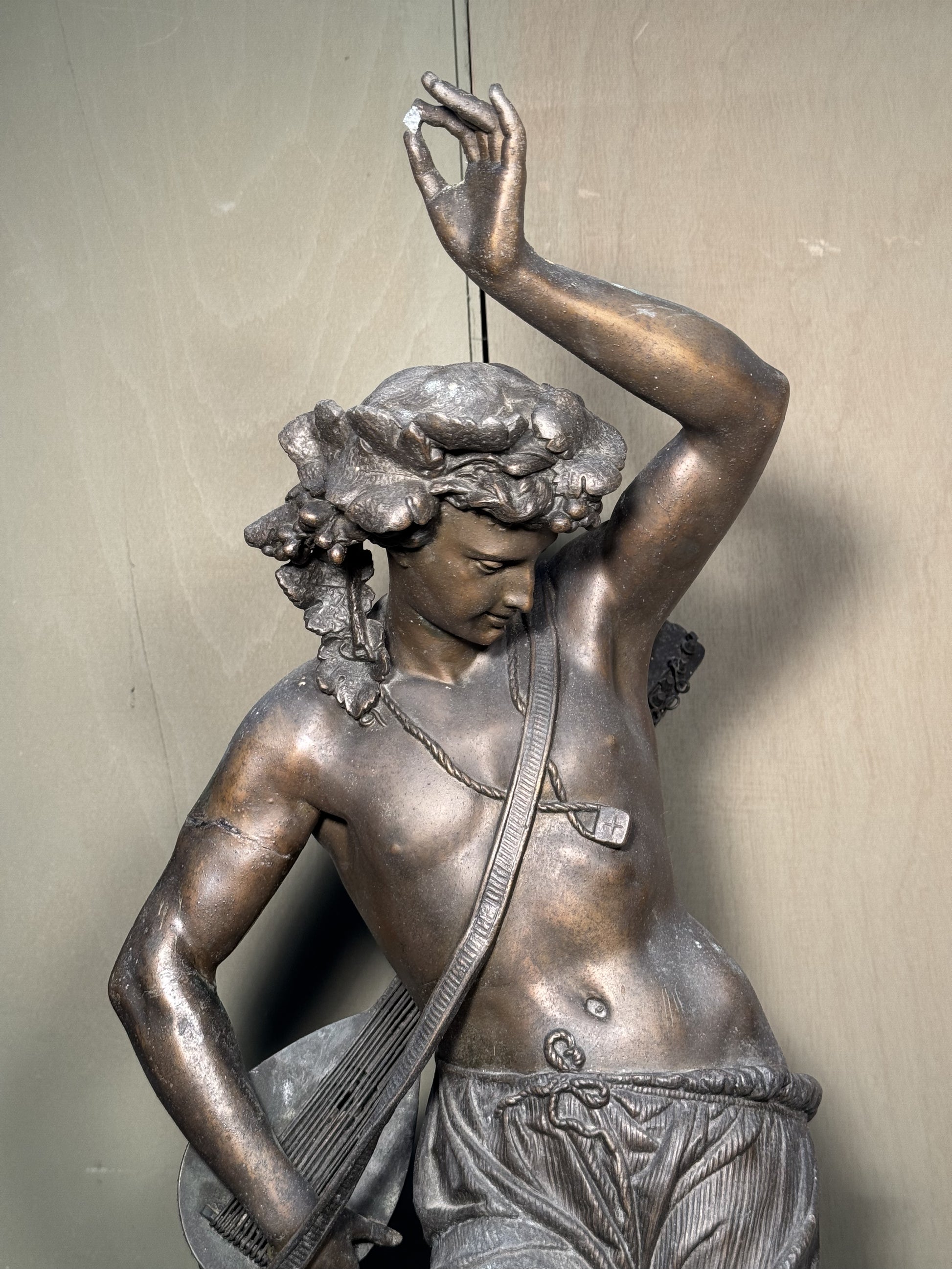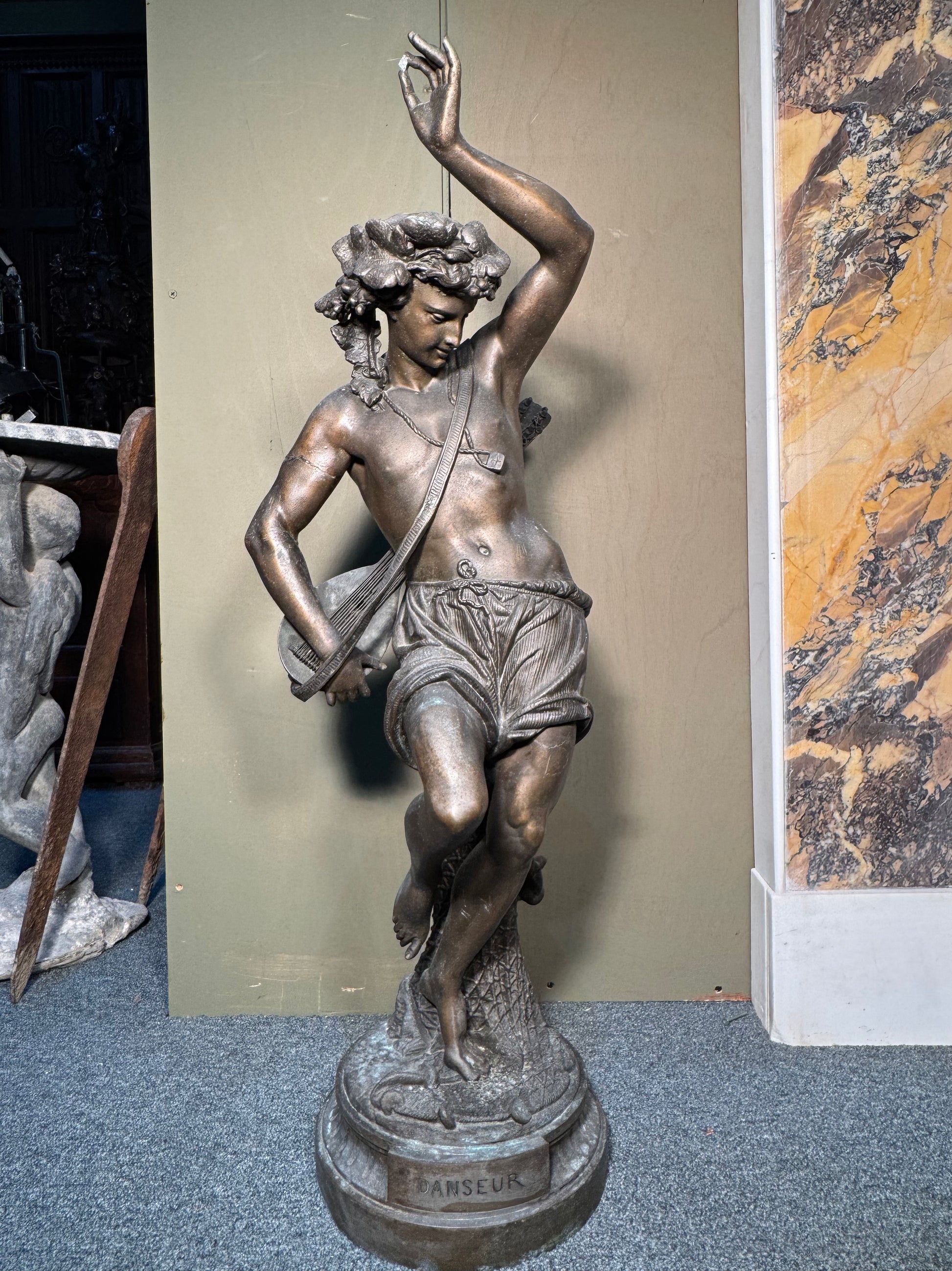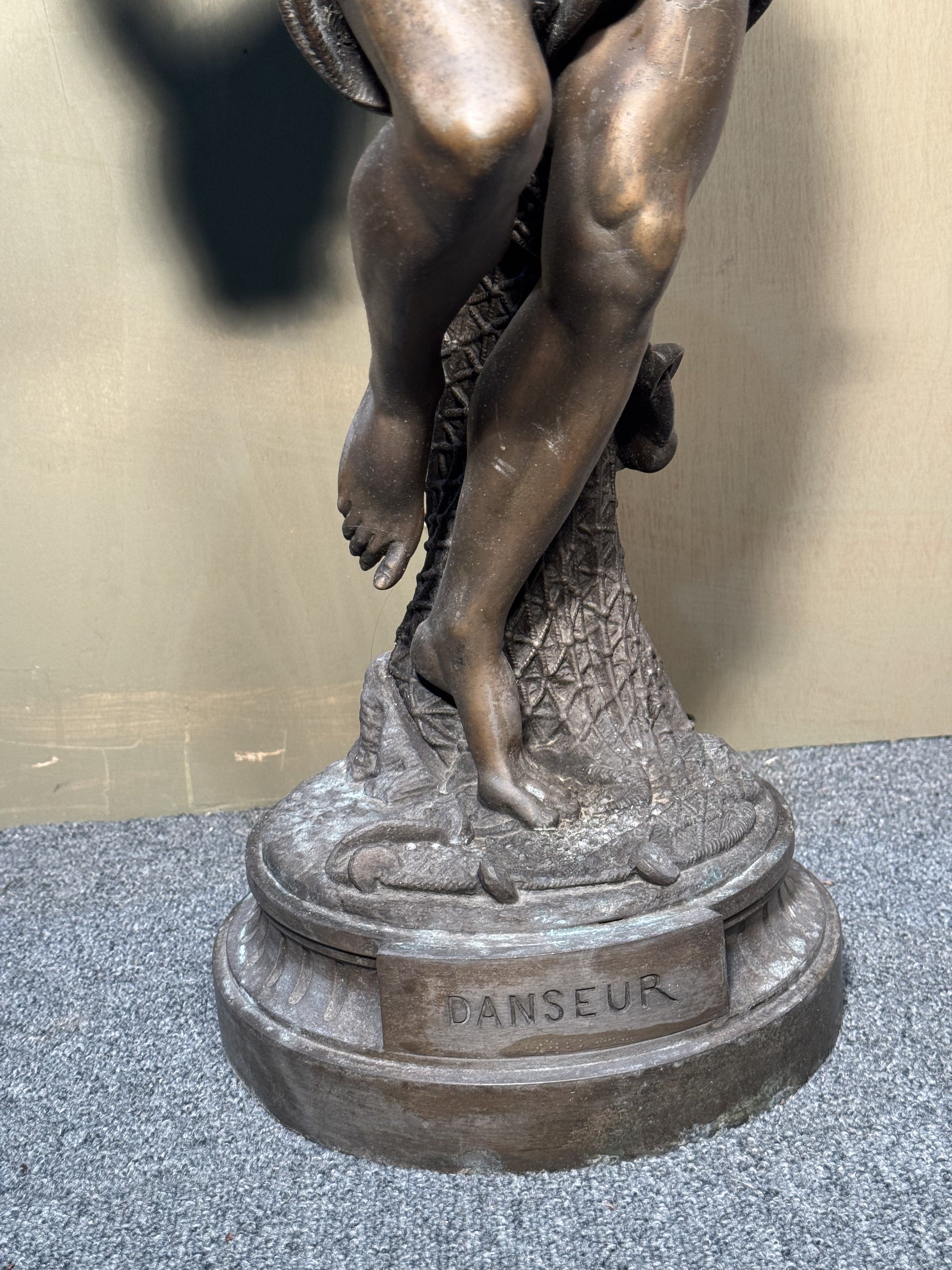 An elegant sculpture capturing the fluid motion of a young male dancer in mid-movement. His graceful pose is accentuated by the fine details of his flowing garments and expressive features, embodying a sense of poise and rhythm. The figure stands on an intricately designed open base, inscribed with the word "Danseur," which adds a touch of classical elegance. This piece is perfect for those who appreciate the beauty of dance and the arts.