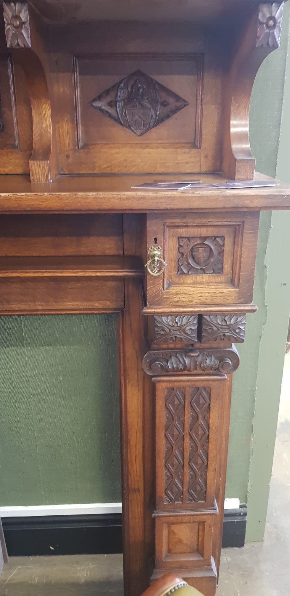 The upper section of the fireplace includes finely crafted cabinetry with leaded glass doors, perfect for showcasing your most treasured items. The carvings along the mantel and sides display a dedication to intricate design, with heraldic crests and floral elements bringing life to the piece.