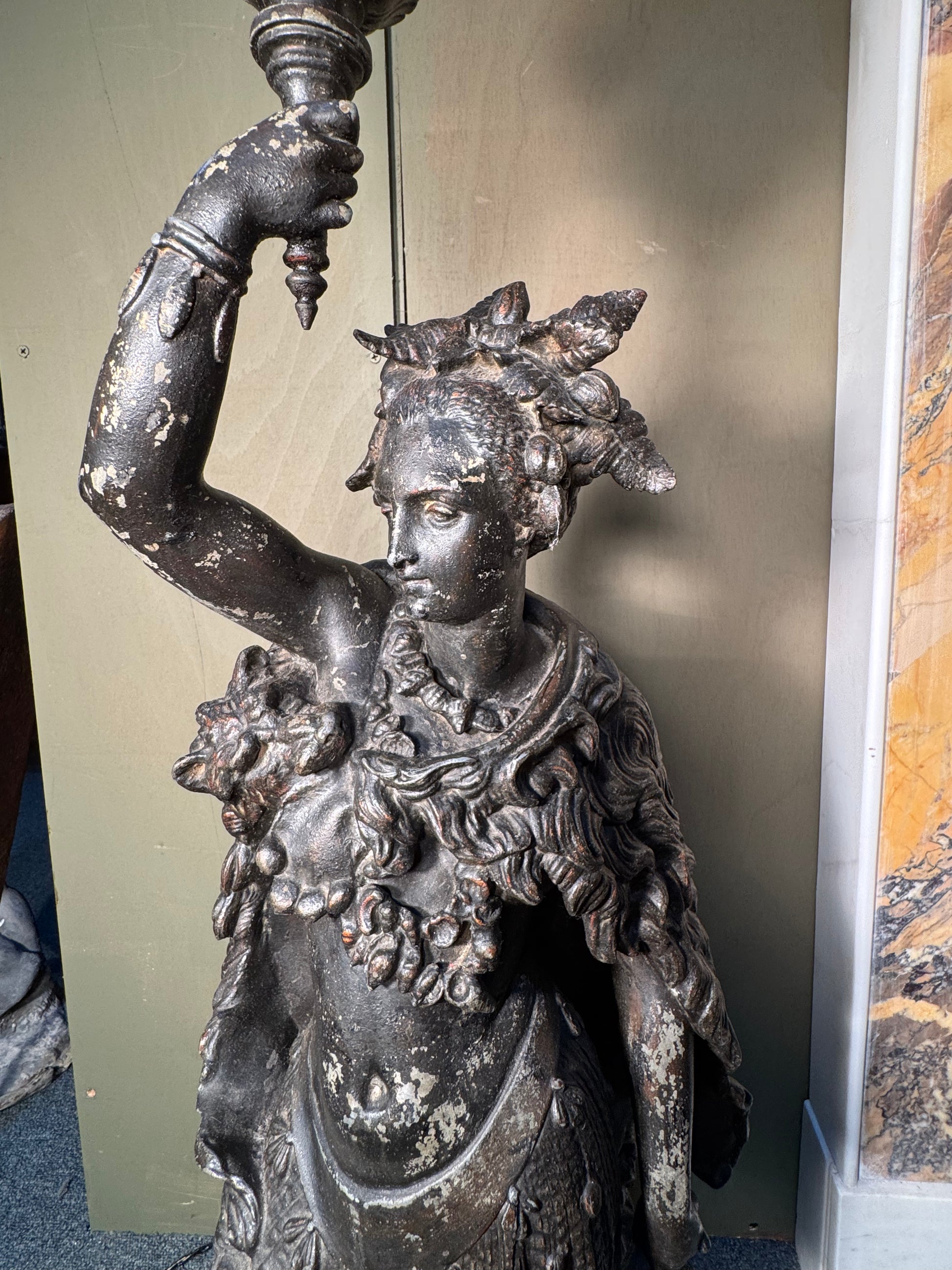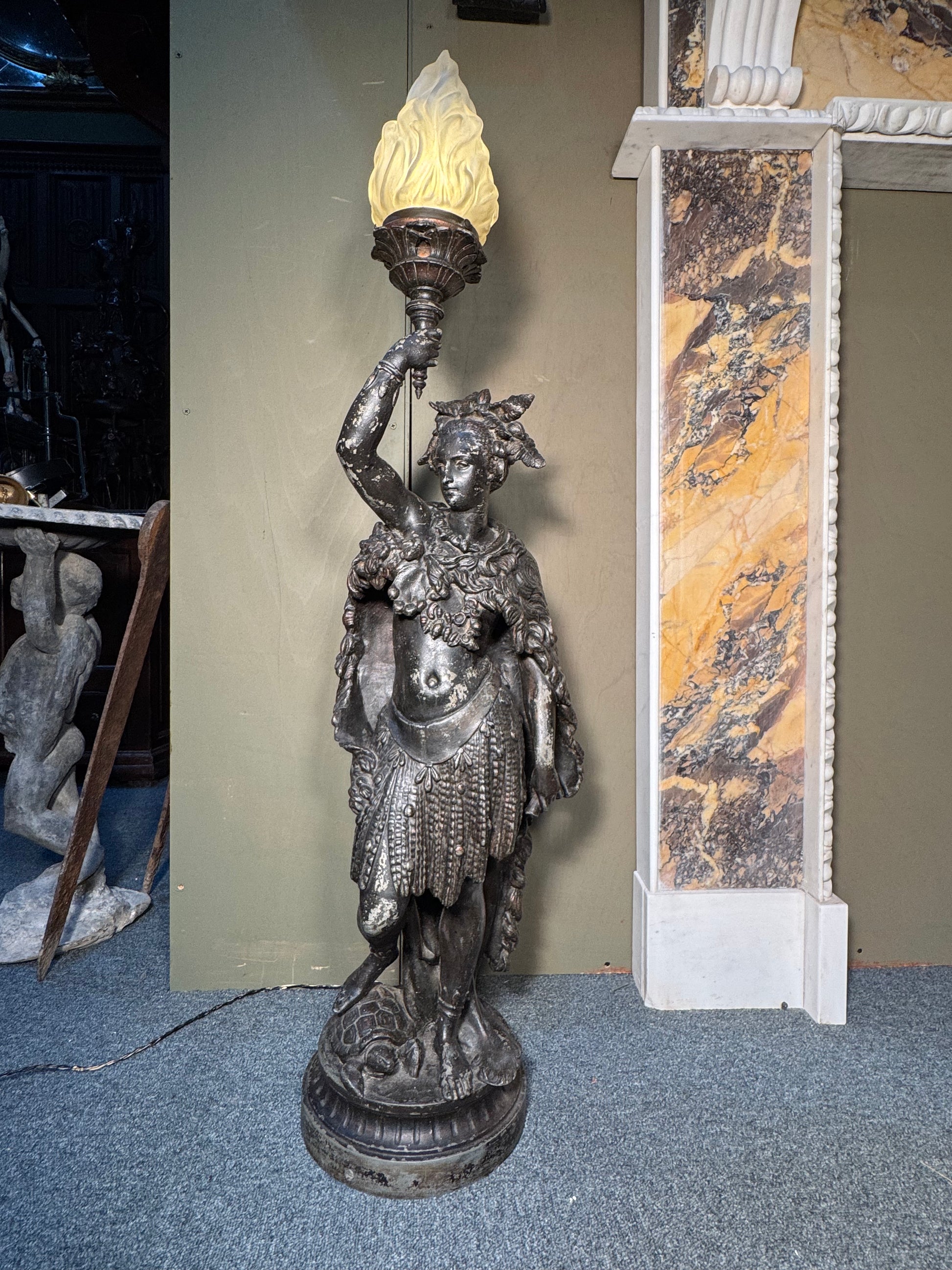 This Grecian Warrior Lamp stands impressively, featuring a detailed statue of a warrior woman. She is adorned in traditional Greek armour with intricate detailing, including a helmet decorated with feathers and a breastplate. The warrior holds a torch, which is the lamp's light source, crowned with a flame-shaped glass shade. The statue stands on a round base, where a turtle is sculpted, adding to the elaborate design. The warrior's stance and the overall craftsmanship suggest a period piece, likely inspired by ancient Greek art and mythology.