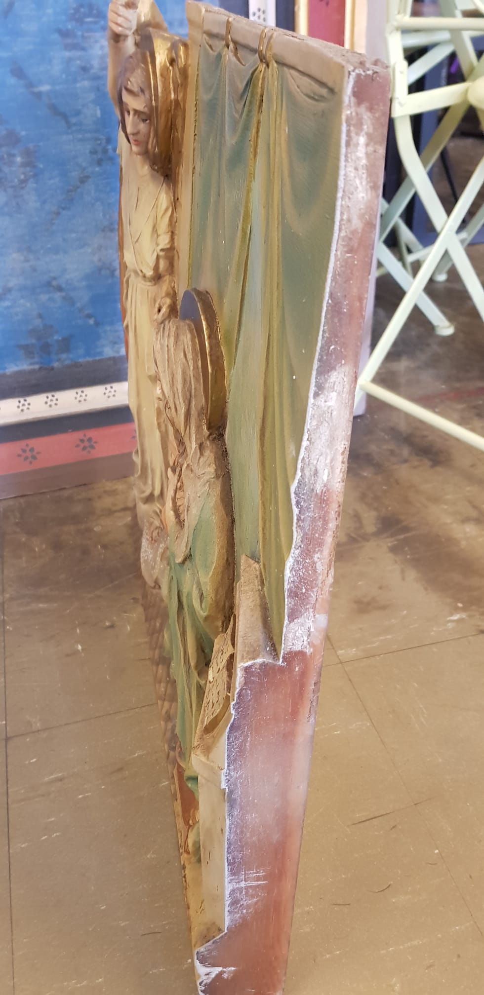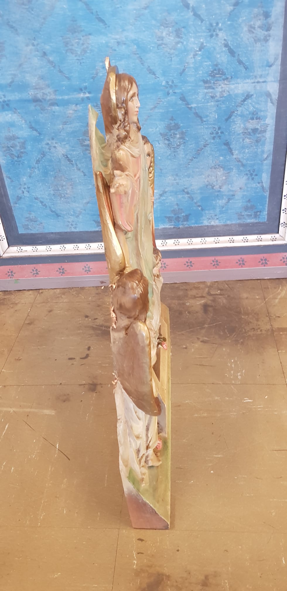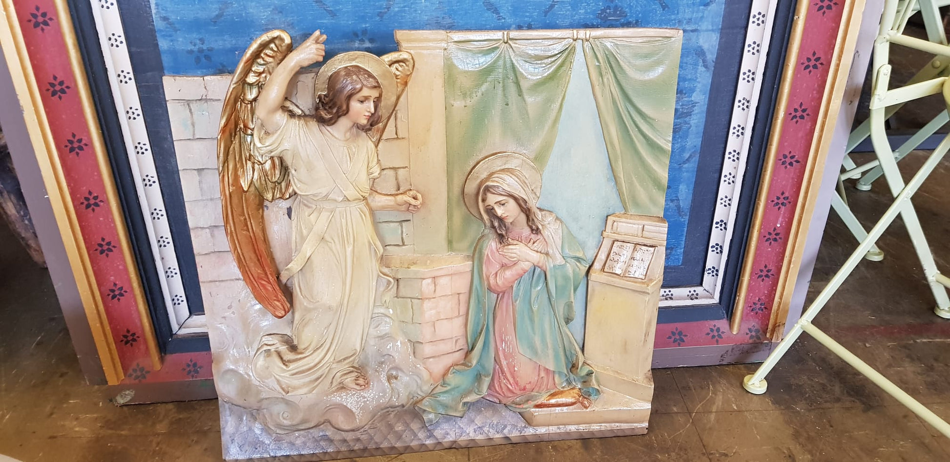 The piece is hand-painted with soft colours that enhance the delicate features of the angelic figures and the serenity of the Virgin Mary, blending perfectly with the textured carving to bring the biblical narrative to life. Crafted from high-quality wood, this panel is not only a work of art but a devotional artifact, ideal for use in a chapel, church, or personal space dedicated to reflection and prayer.