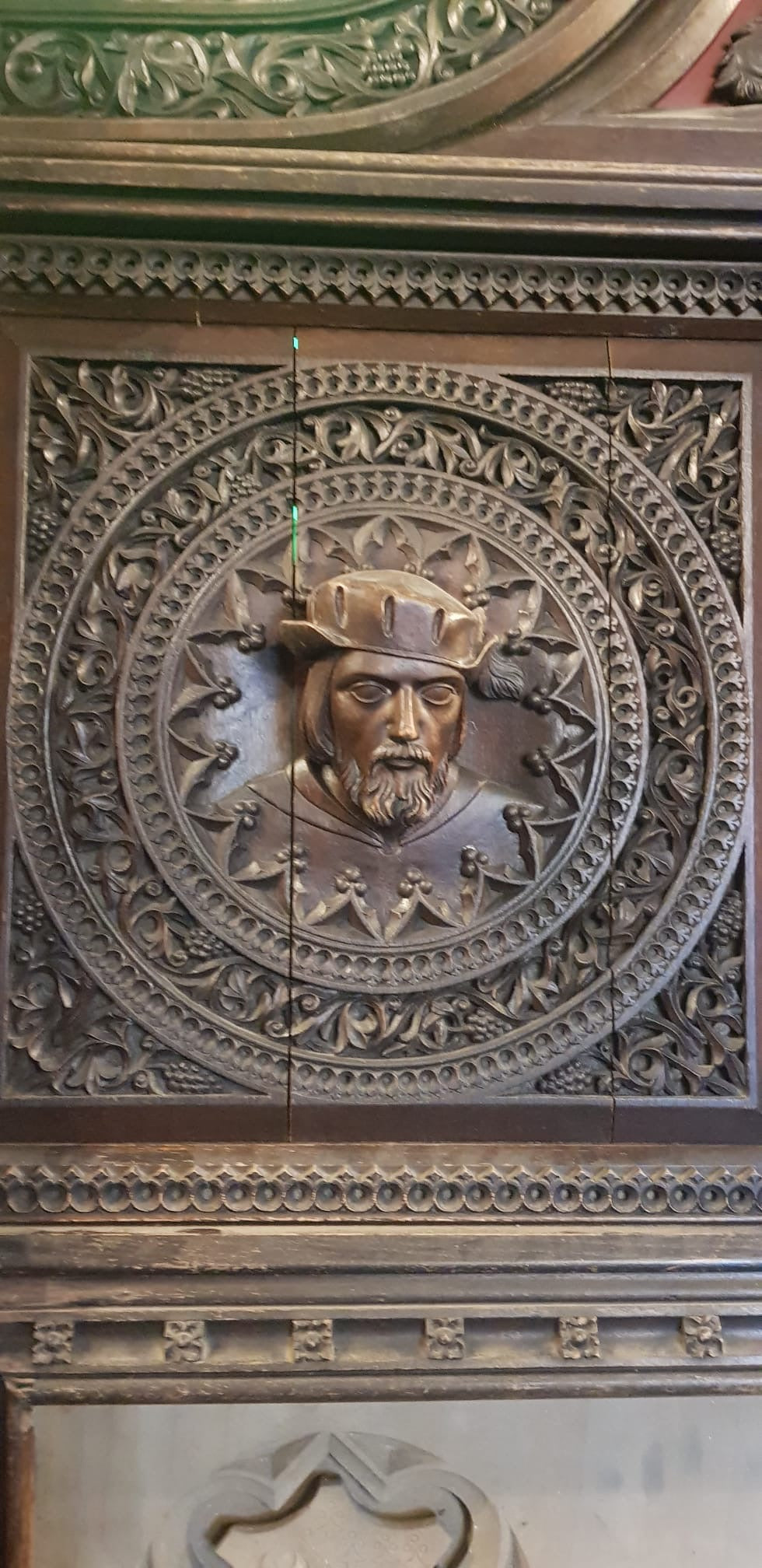 The intricate carvings also feature **Tudor roses**, symbolising the union of the **Houses of York** and **Lancaster**, following the end of the **War of the Roses** in 1487. The roses are meticulously carved into the oak panelling, a tribute to the **Tudor dynasty**, which marked one of England’s most prosperous and culturally rich periods, lasting from 1485 to 1603.