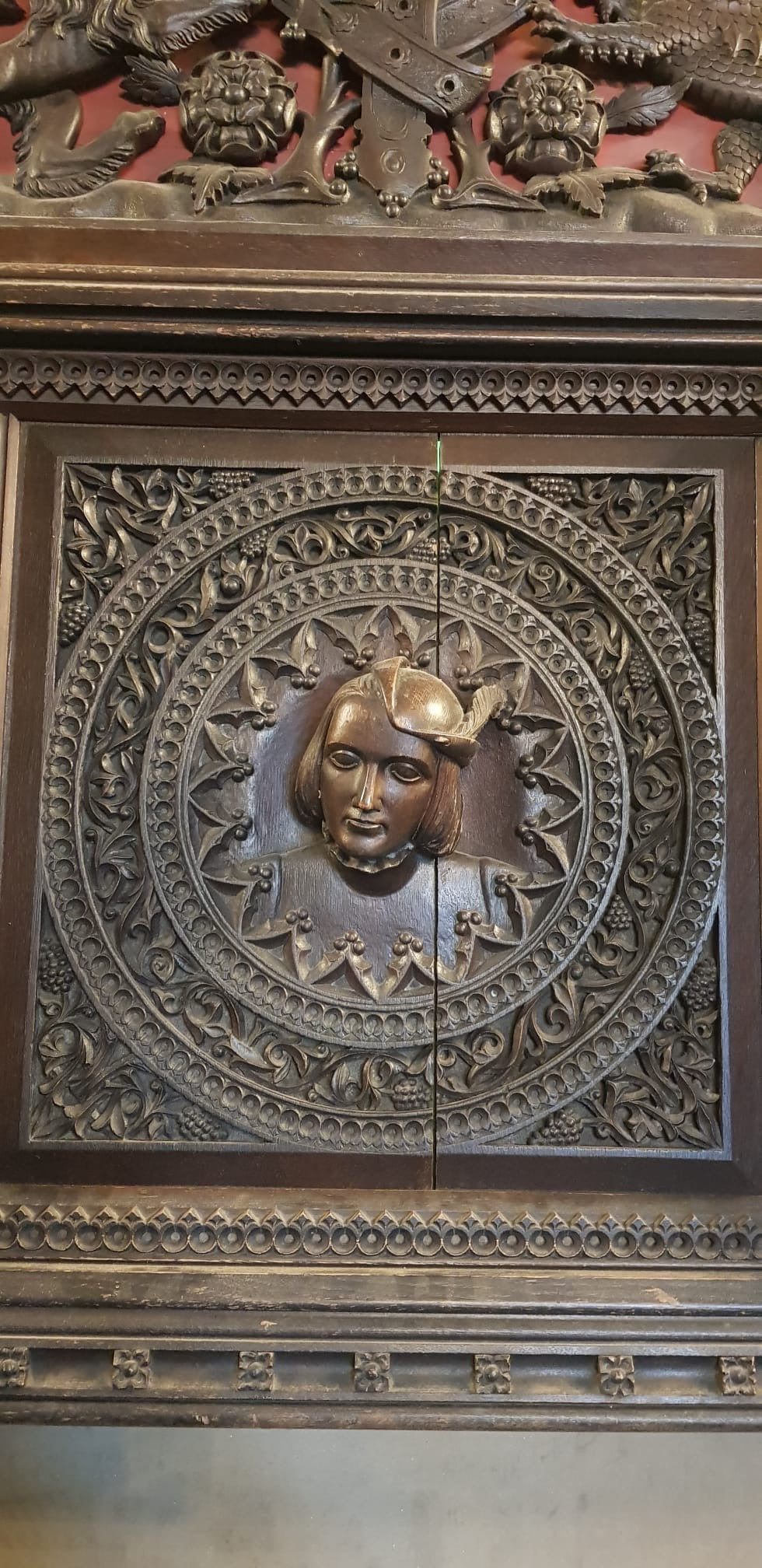 This highly carved antique oak panelled room is not just a testament to the Victorian era’s craftsmanship, but also a tangible link to one of England’s most storied political figures and his ancestral heritage. The room’s historic elements—its heraldic shields, Gothic carvings, Tudor roses, and regal motifs—make it a remarkable piece of architectural history.