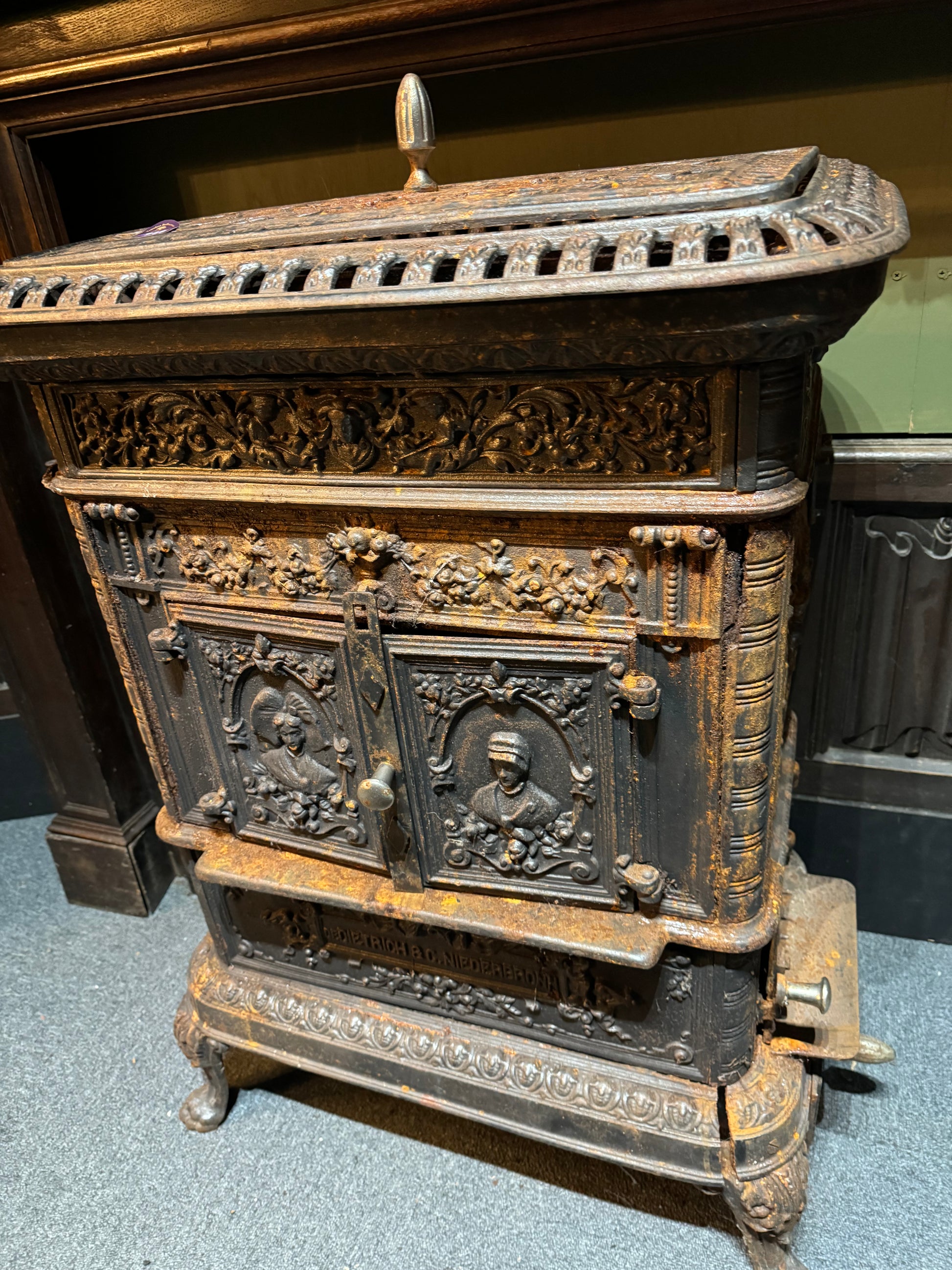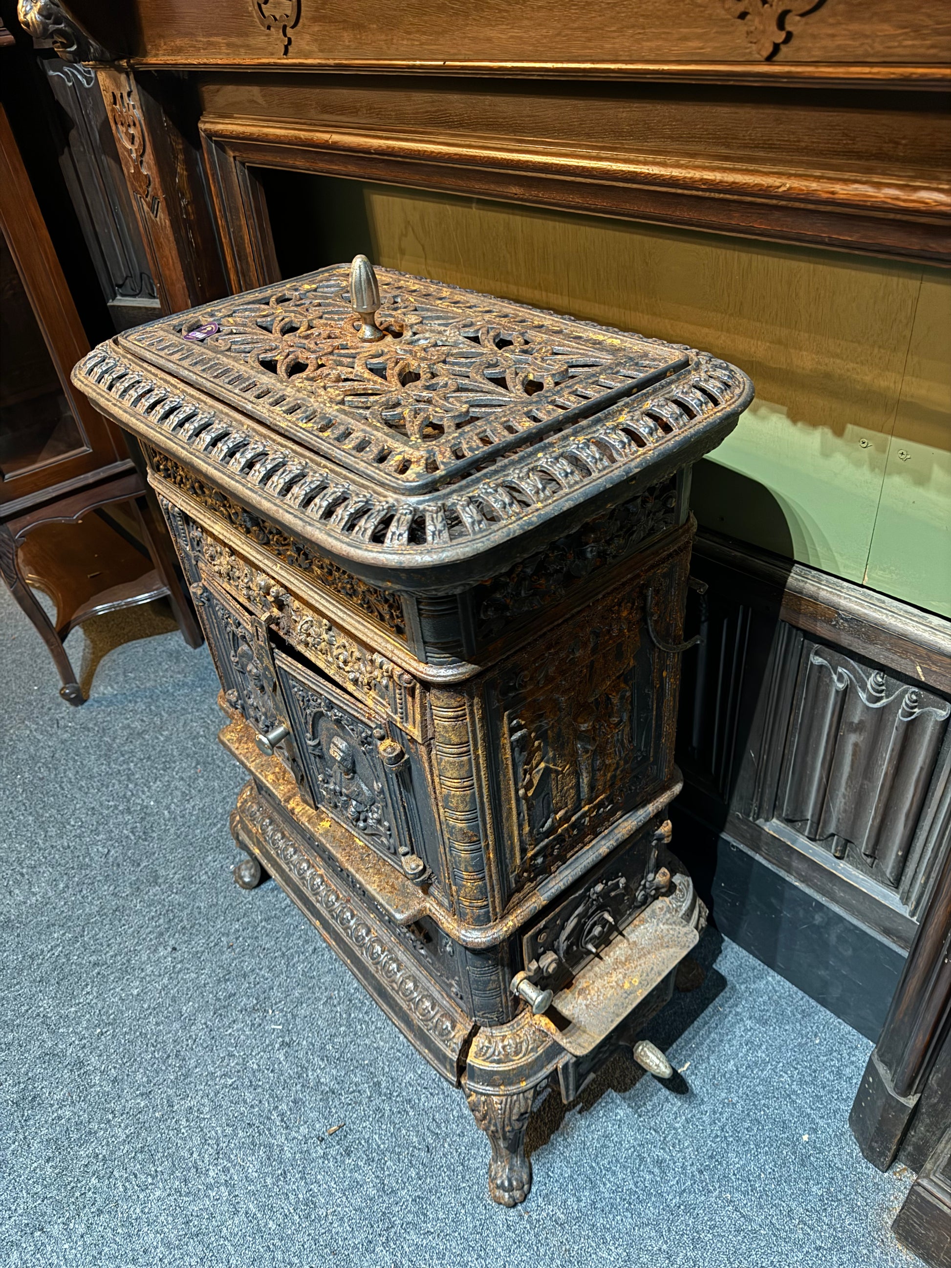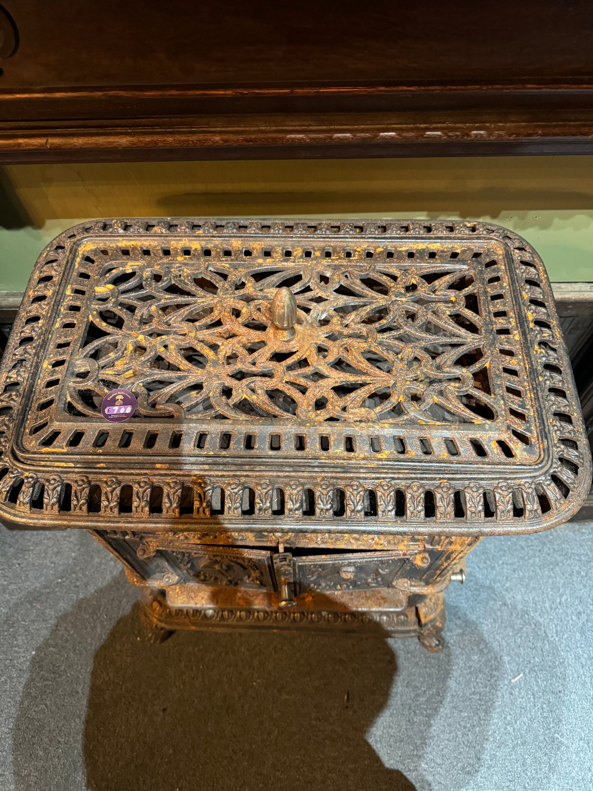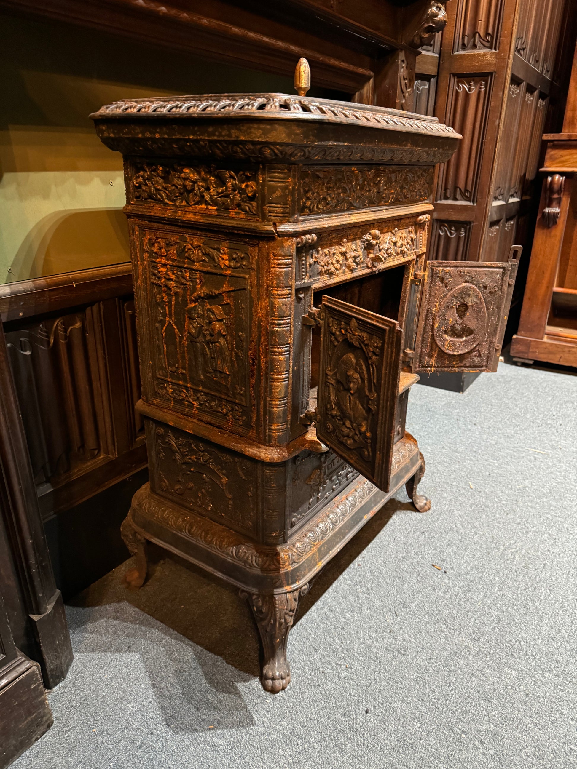 Introducing the Imperial Lion Hearth Grate, a remarkable piece of antique fireplace furniture that exemplifies the opulence and meticulous craftsmanship of the Victorian era. This dog grate, designed to hold firewood or coal, features intricate ironwork with regal lion motifs and elaborate scrolling patterns, making it a focal point of any fireplace.
