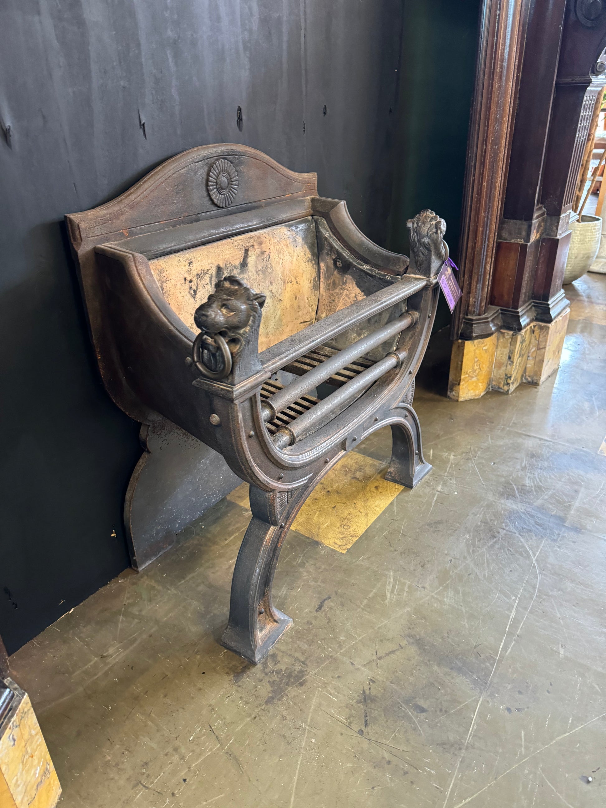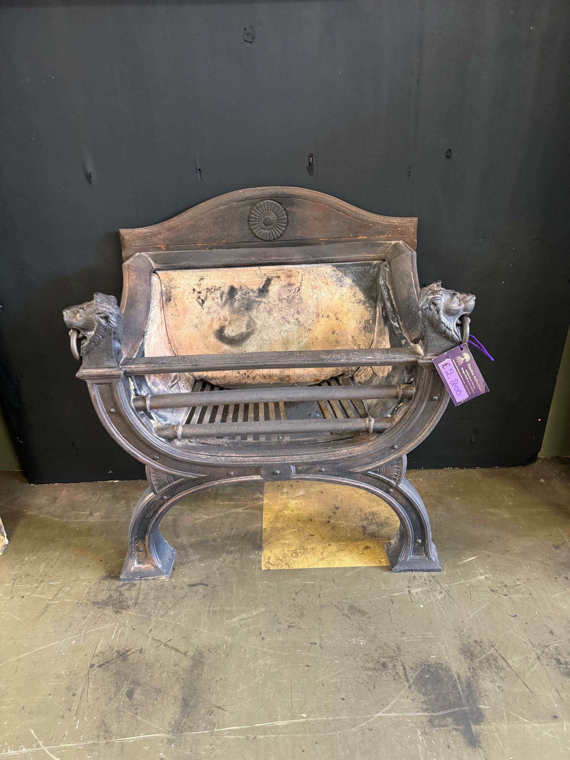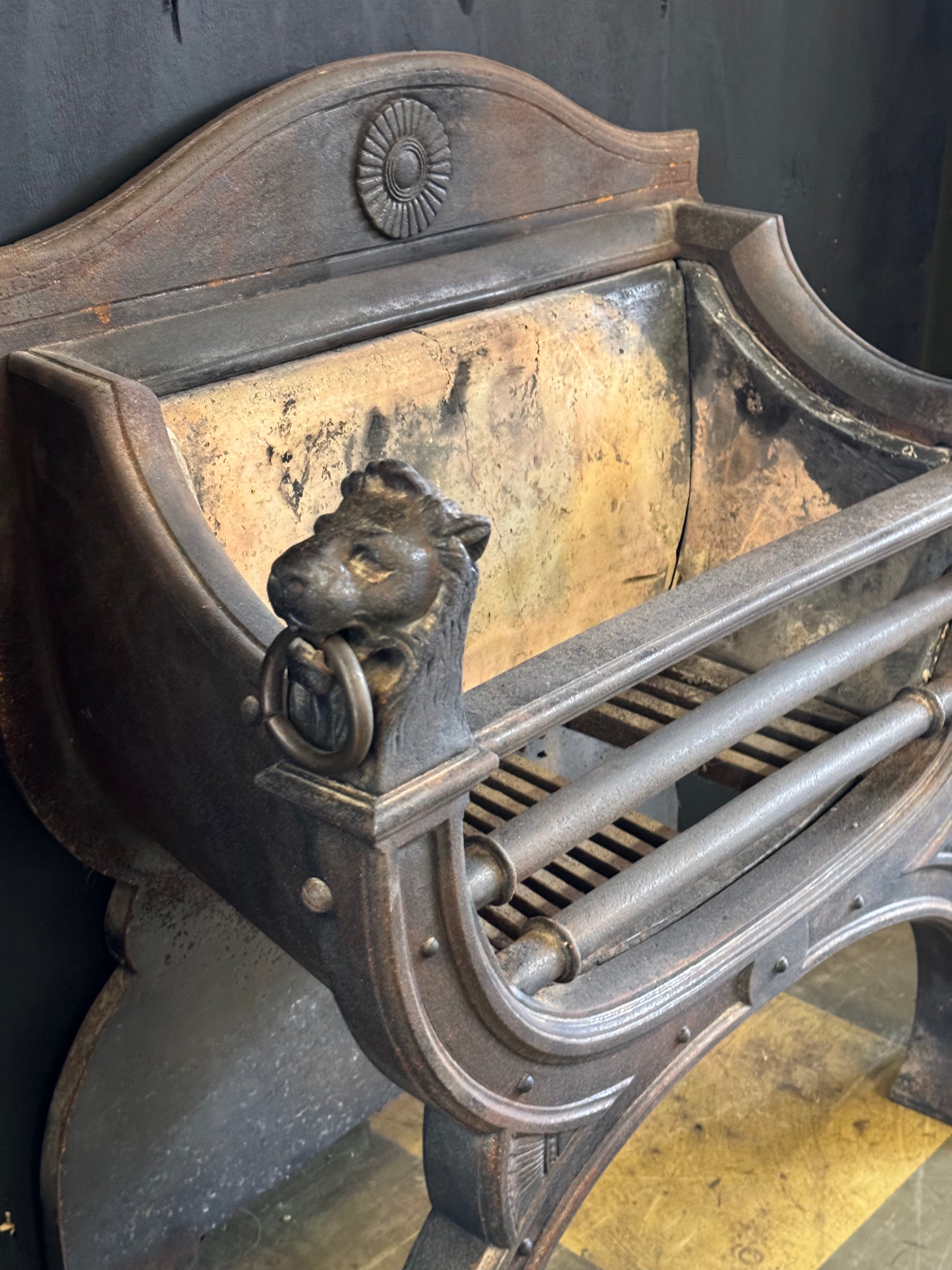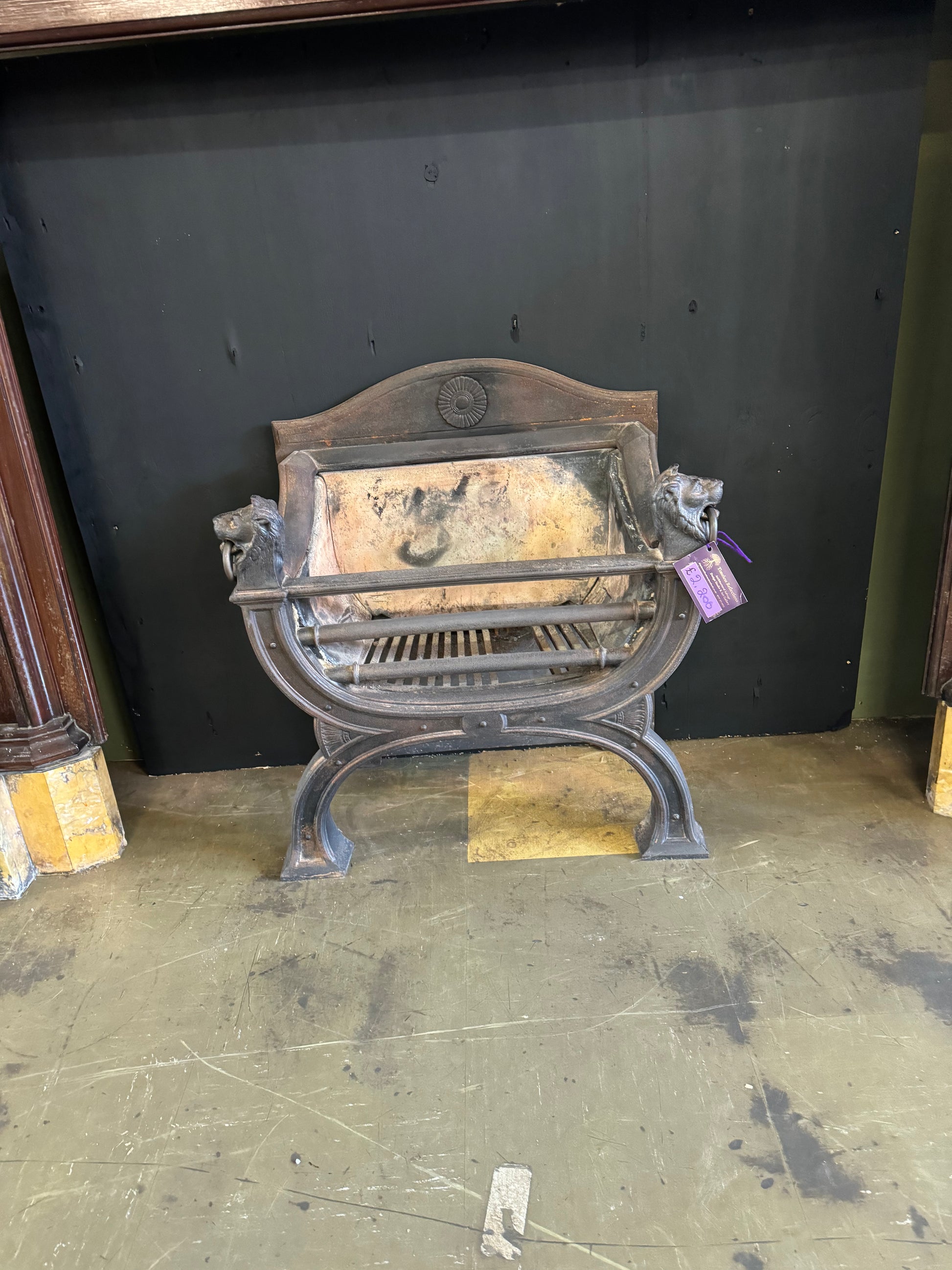 The front of the grate displays detailed ornamentation, including majestic lion heads, while the sturdy side bars and backplate provide both durability and functionality. The iron has developed a rich, dark patina over the years, enhancing its antique charm and making it a stunning focal point in any fireplace setting.