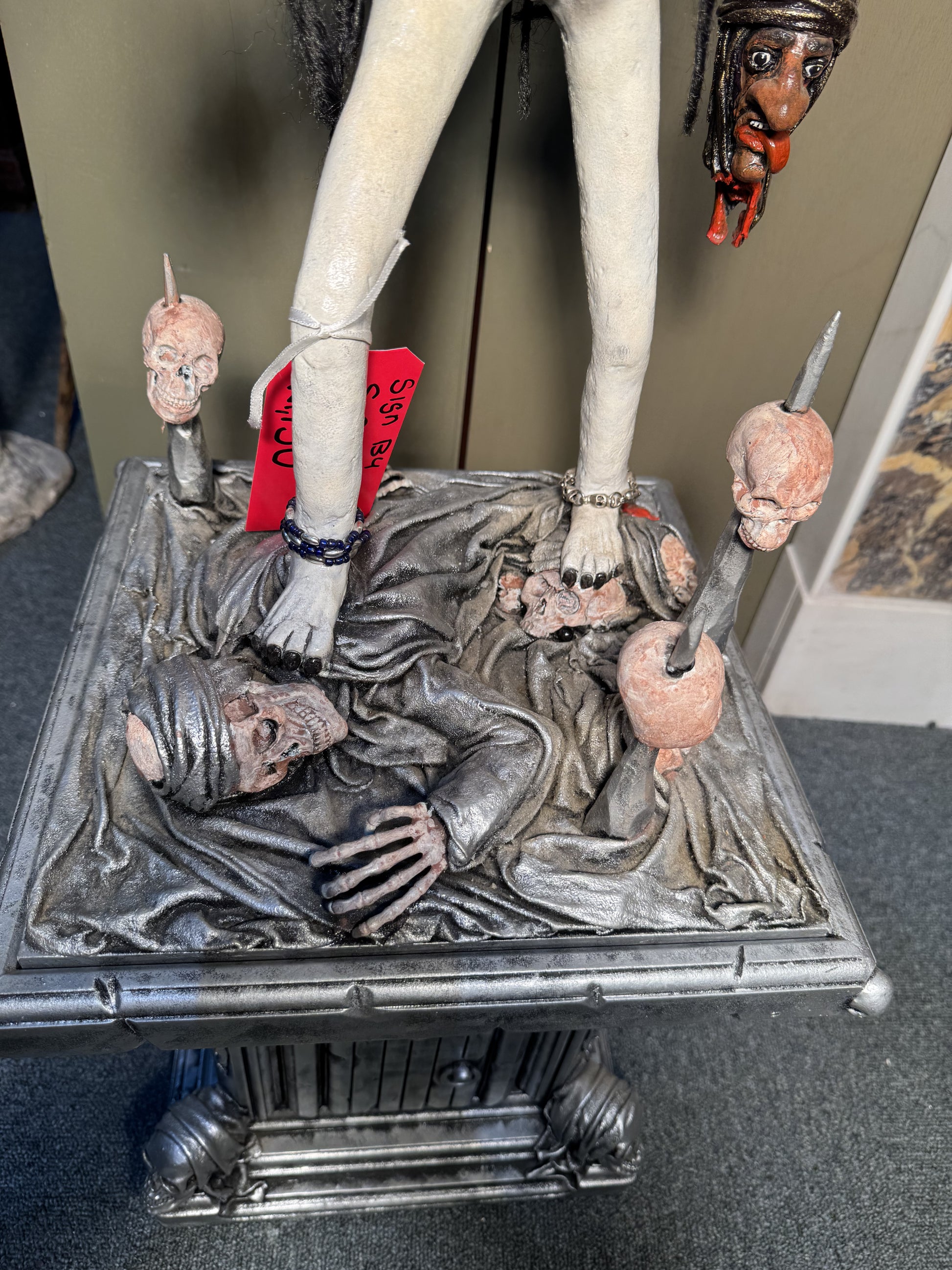 The sculpture is crafted with meticulous attention to detail, highlighting the intricate textures and vibrant expressions. Her ferocious stance is complemented by the gruesome display of skulls and skeletal remains at her feet, further emphasizing her power and might. The base of the sculpture, designed to resemble an ancient altar, adds to the piece’s authenticity and mystique.