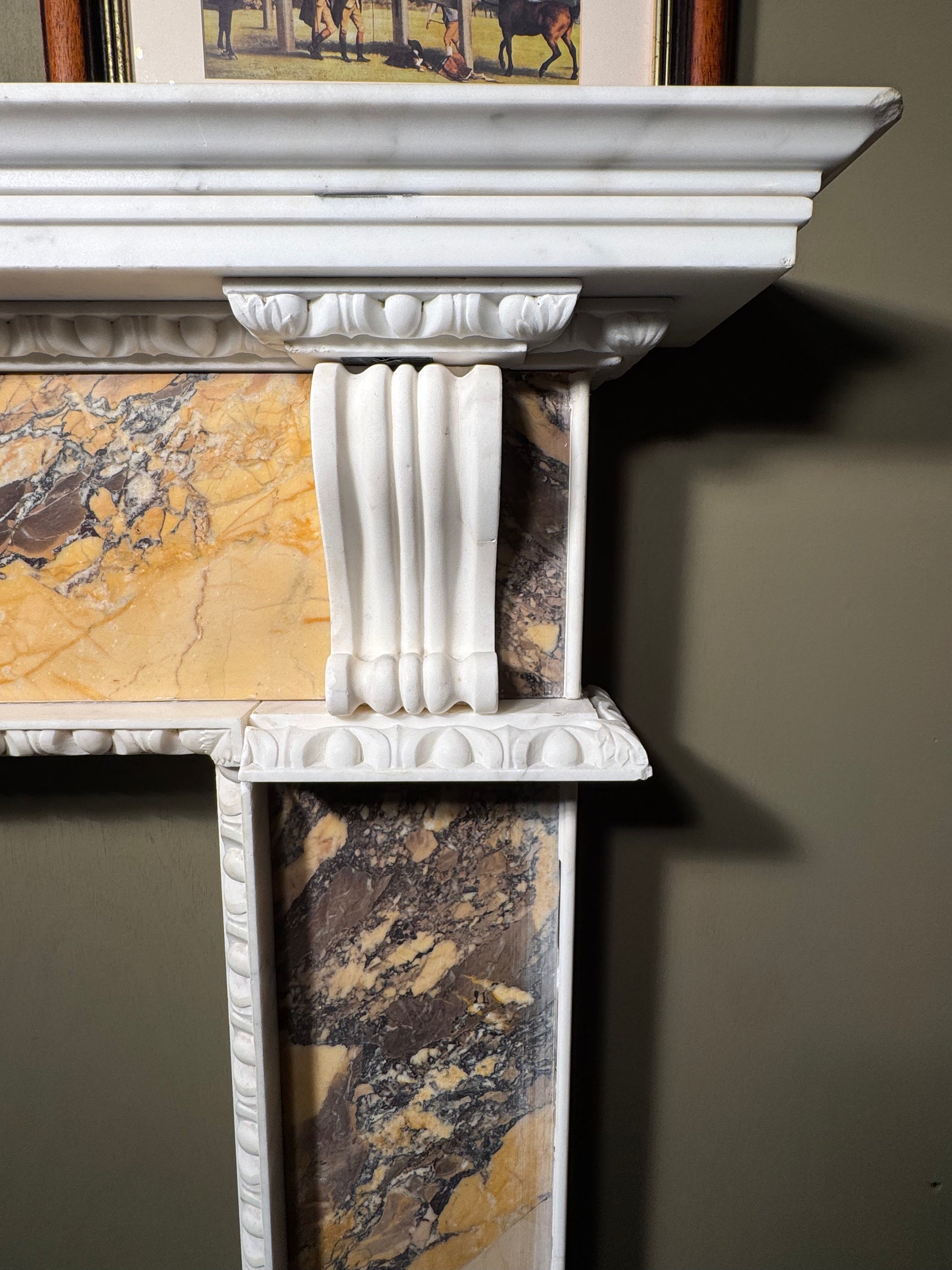 Presenting an exquisite Sienna Marble Fireplace, an elegant piece that epitomises classical design and sophistication. This fireplace features beautiful Sienna marble panels that showcase a rich blend of warm tones and intricate veining, providing a luxurious backdrop for any room. The white marble elements, adorned with detailed carvings including draped swags and classical urn motifs, add a touch of timeless elegance and grandeur.