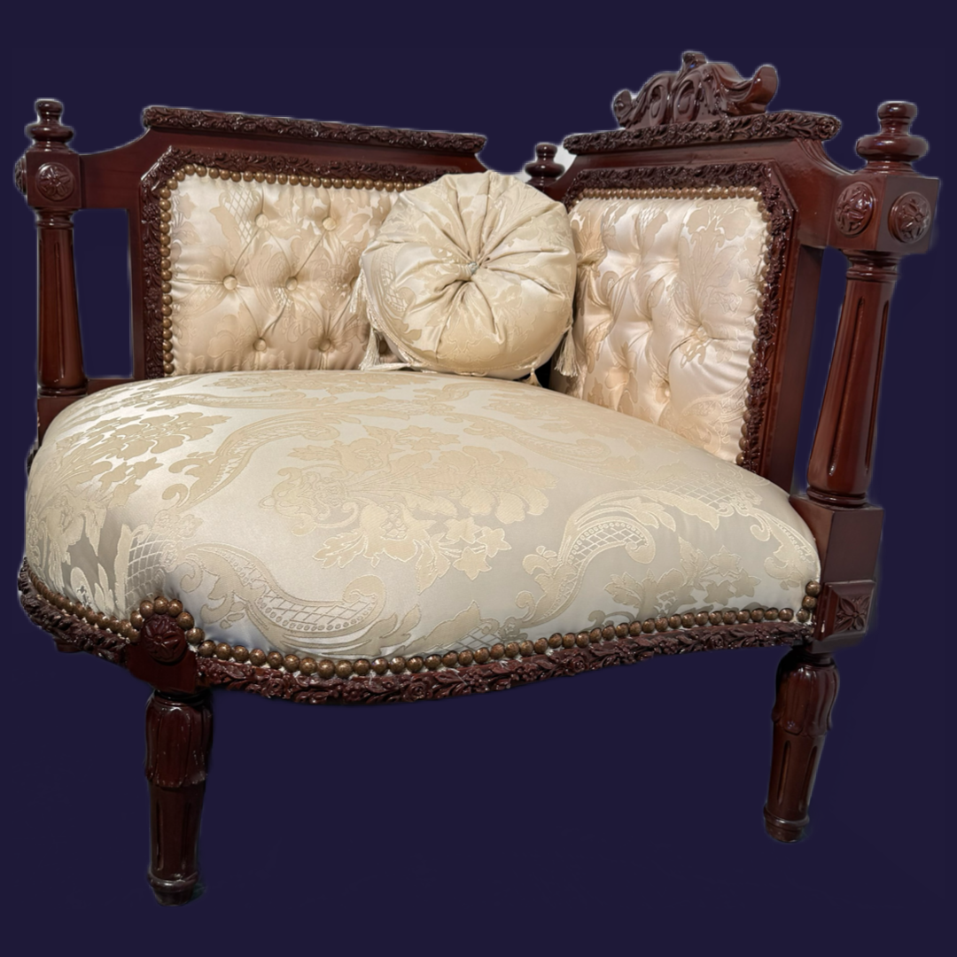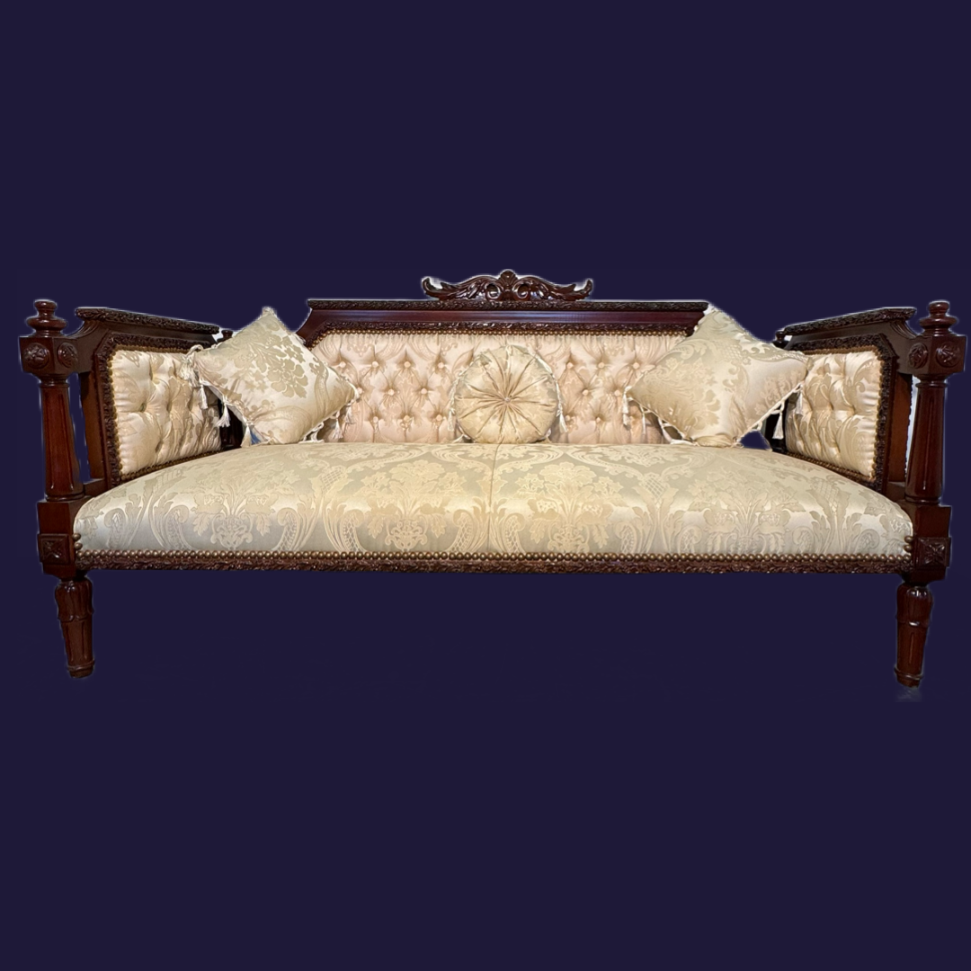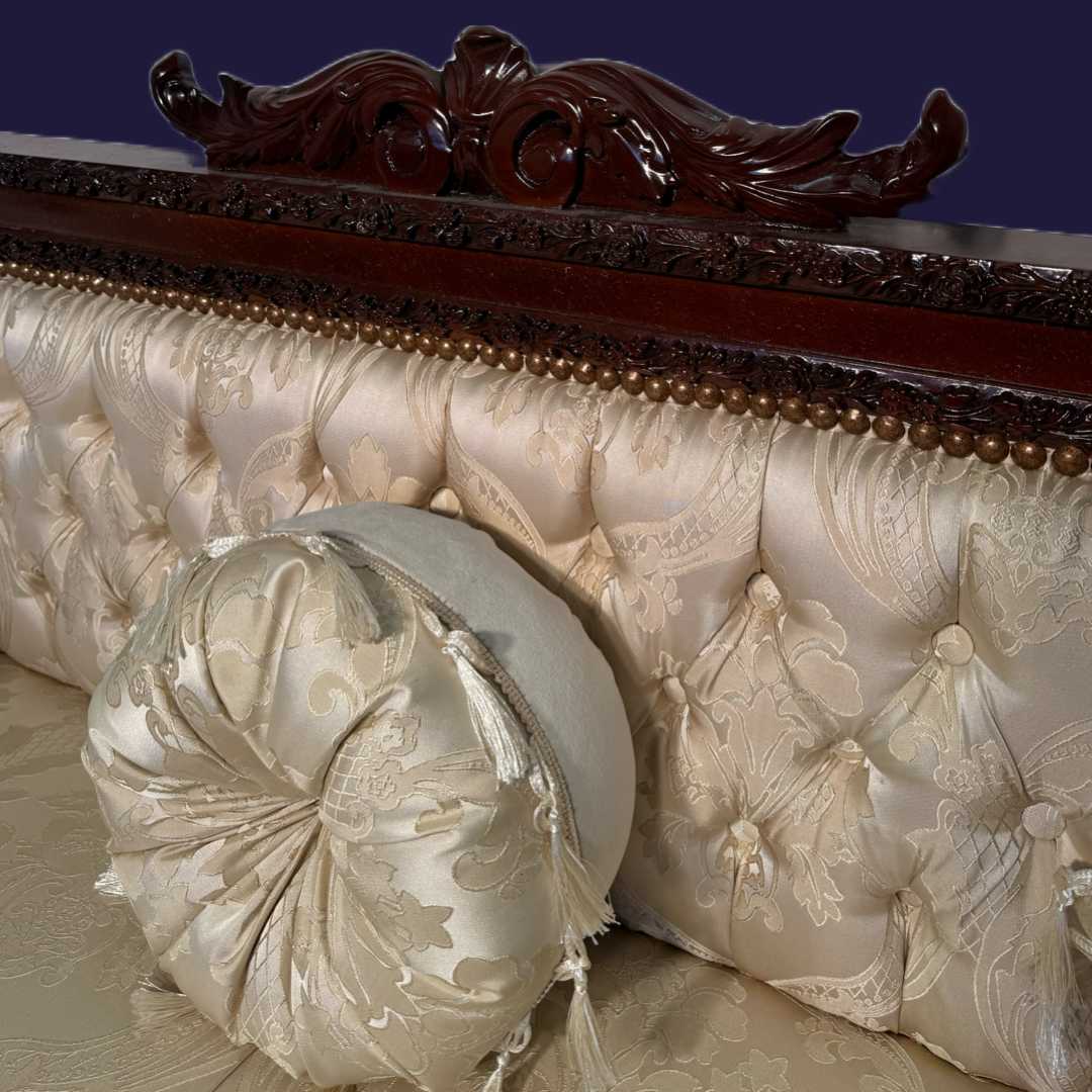 The Buckingham Seating Collection exudes luxury and traditional elegance, featuring a matching set of meticulously crafted pieces: a three-seater sofa, a two-seater sofa, and two corner chairs. Each item is adorned with intricate wood carvings, a beautiful tufted backrest, and sumptuous upholstery in a soft damask pattern, adding a touch of opulence to any living space. The richly polished wood frame complements the upholstered fabric, creating a timeless aesthetic ideal for formal lounges, drawing rooms, or grand interiors. Embrace classic style and comfort with the Buckingham Collection’s exquisite craftsmanship and refined details.