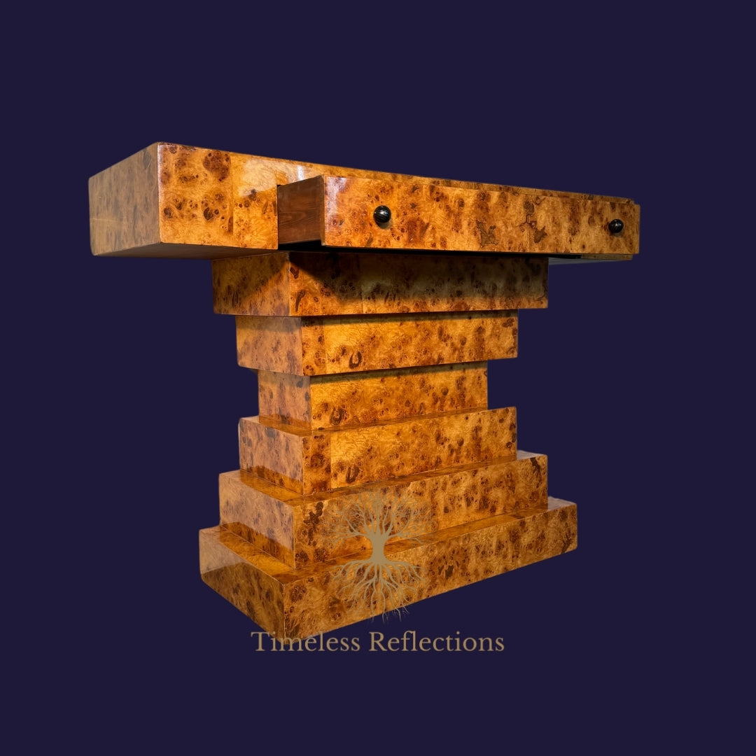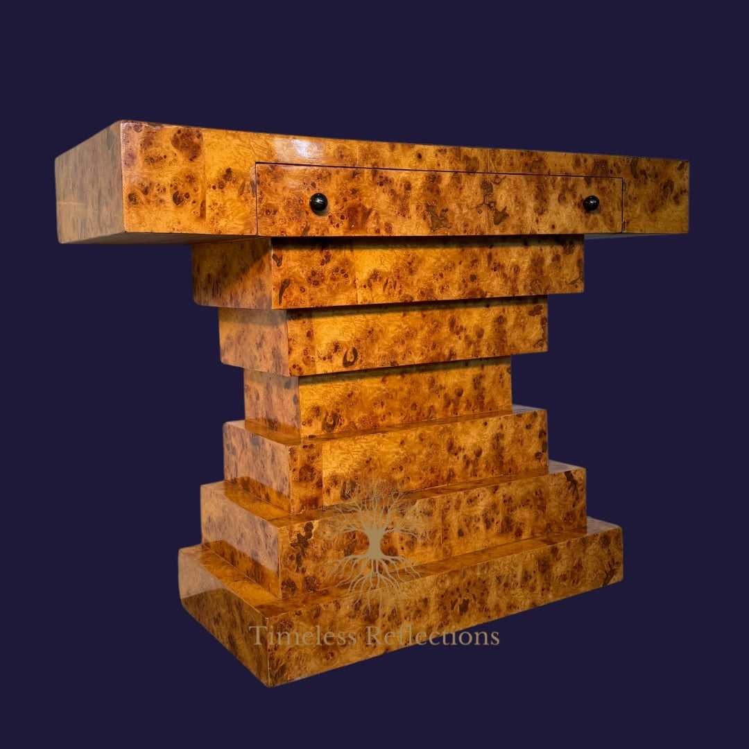 The Elston Console is a bold statement piece that embraces both modern and classical design elements. Crafted from exquisite burl wood, its rich golden tones are enhanced by the stepped pedestal base, giving it a solid, architectural presence. The rectangular top features a subtle grain pattern that contrasts beautifully with the sharp lines of the structure. Complete with sleek black drawer pulls, this console is not only visually striking but also practical, offering hidden storage.