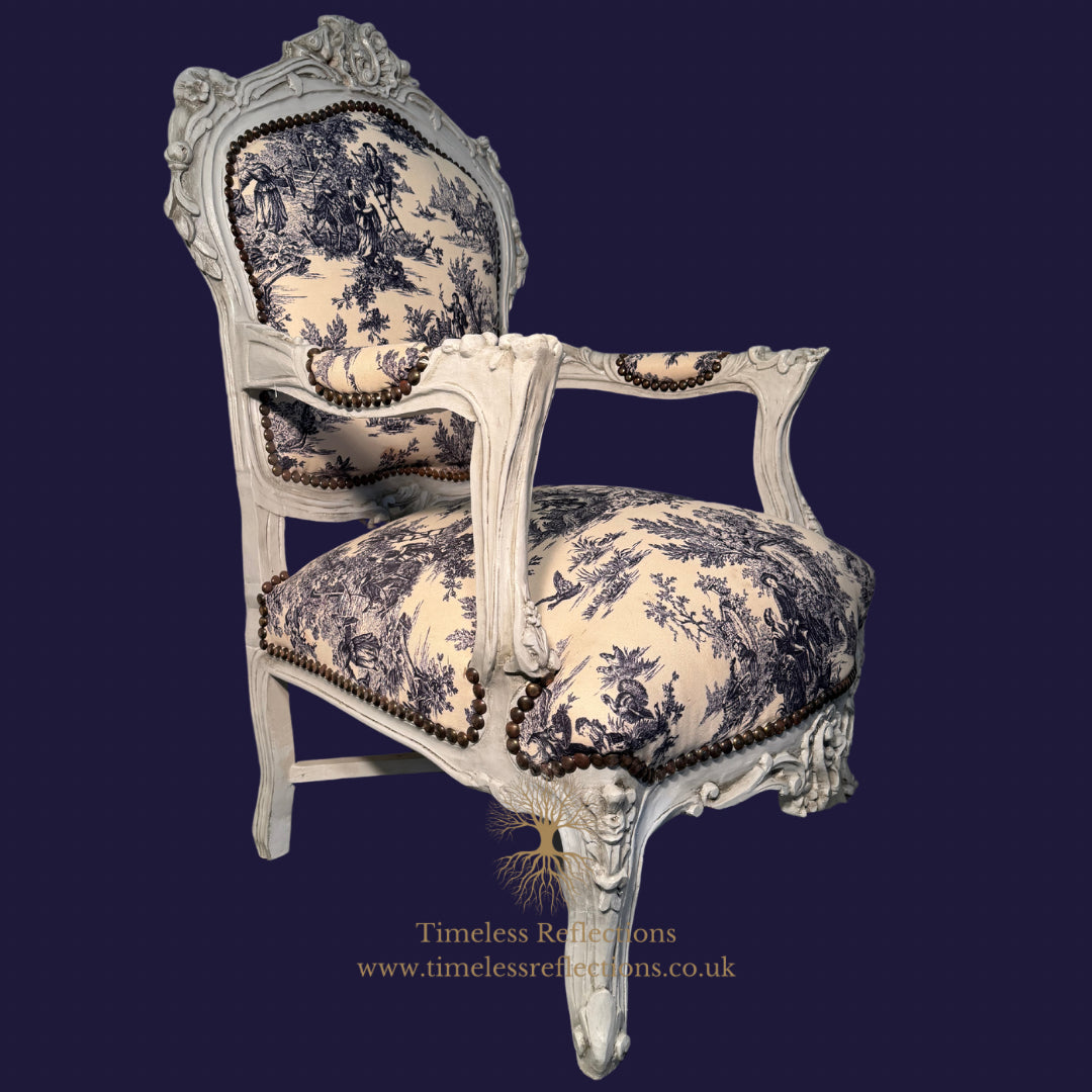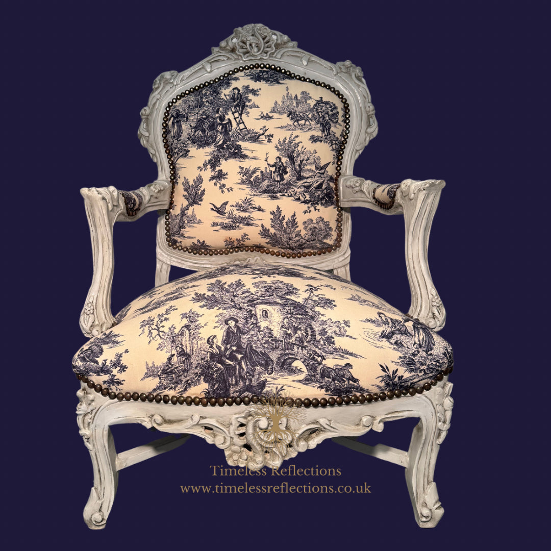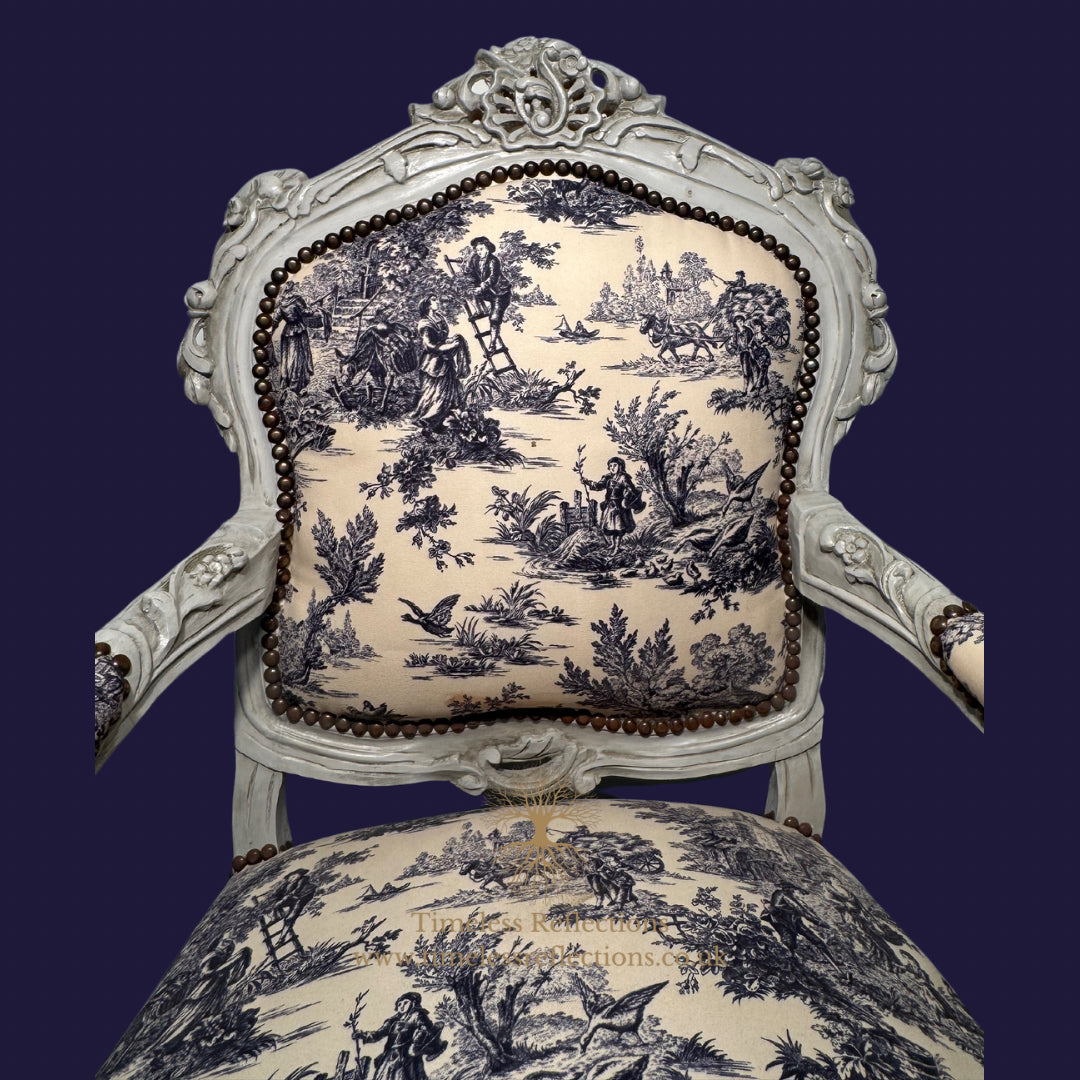 Revel in the nostalgic charm of “The Enchanted Garden Throne,” a resplendent chair that brings to life the idyllic scenes of pastoral life. Crafted with meticulous attention to detail, this chair showcases an intricately carved frame adorned with floral and rococo motifs, painted in an elegant distressed white finish to enhance its vintage allure. The upholstery is a masterpiece of its own, featuring a toile de Jouy fabric depicting classic vignettes of pastoral dances and tranquil nature scenes in a traditional black and white palette. Each cushion is bordered with a complementary brass nailhead trim, providing a perfect finish to this exquisite piece. Ideal for adding a touch of romantic elegance to any living room, bedroom, or vanity area.