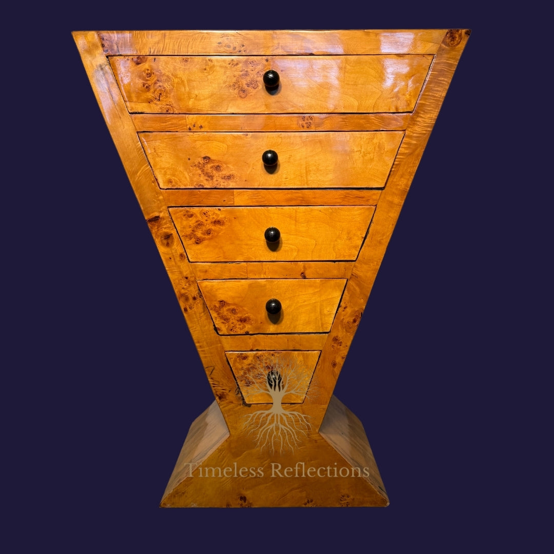 Sculptural and striking, the Fallon Drawers bring an avant-garde silhouette to your space. With five graduated drawers tapering downwards into a striking pyramid-like shape, this piece effortlessly marries bold geometry with timeless elegance. Crafted from richly patterned wood, the natural grains and textures are elevated with a smooth, high-gloss finish, creating an eye-catching centrepiece. Each drawer is finished with elegant black knobs, providing a sleek contrast to the organic wood tones. The Fallon Drawers offer not only artistic beauty but also practical storage, making it a perfect blend of form and function. Ideal for sophisticated interiors looking for a piece with personality.
