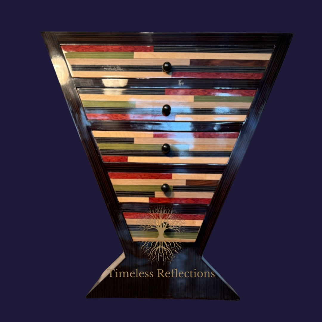 Bring a touch of bold artistry into your living space with The Felix Drawers. Featuring a captivating geometric pattern with intricate marquetry in contrasting hues, this drawer set stands out as a focal point in any room. The tapered triangular design not only adds a sense of movement but also offers a sophisticated modernist aesthetic. Handcrafted with precision, each drawer glides smoothly, perfect for storing essentials while maintaining an artistic appeal.