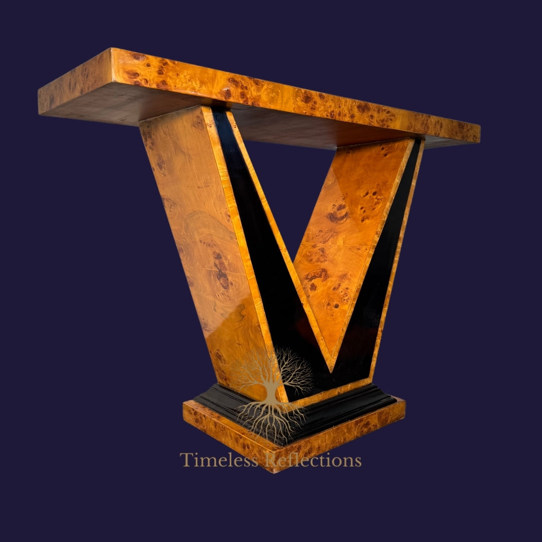 Bold in design and flawless in craftsmanship, the Valencia Console Table epitomises the harmonious blend of form and function. Its striking V-shaped support, handcrafted from luxurious burl wood, exudes both modernity and timeless elegance. The contrast between the rich wood grain and the sleek black lacquer insets adds a contemporary flair, making this console a statement piece for any entrance hall or living space. The Valencia not only captures the eye but also offers versatility, serving as both a functional surface and an iconic decorative feature.