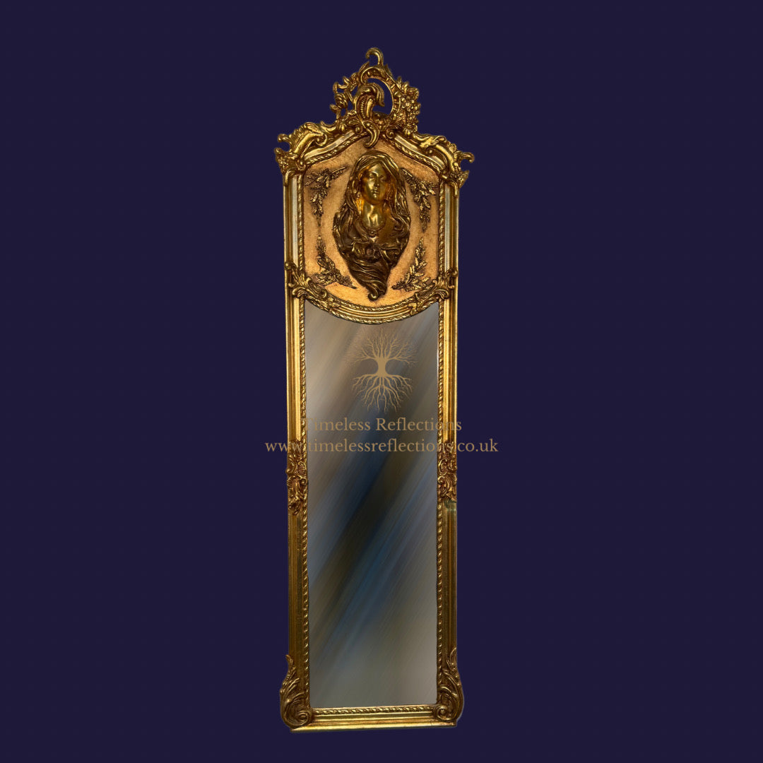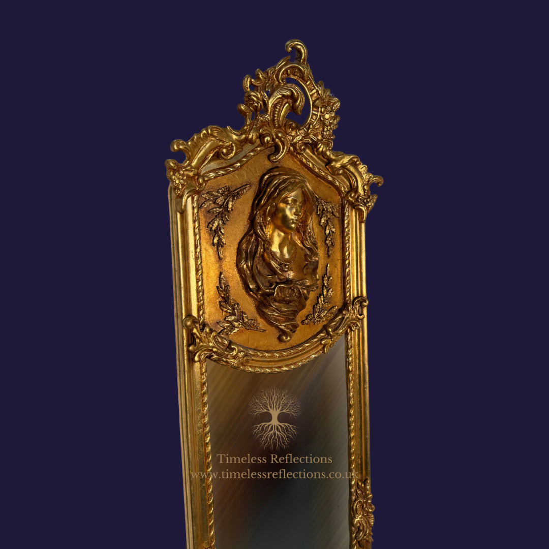 Embrace the grandeur of the Baroque period with The Versailles Full-Length Ornamental Mirror. This exquisite piece features an elaborately crafted golden frame, showcasing intricate floral patterns and classical figures that evoke a sense of timeless luxury. Designed to make a stately impression, this mirror is perfect for enhancing the opulence of any room, from dressing areas to grand hallways. Its reflective surface is bordered by a richly detailed frame, turning a simple act of adornment into an experience of regal elegance.