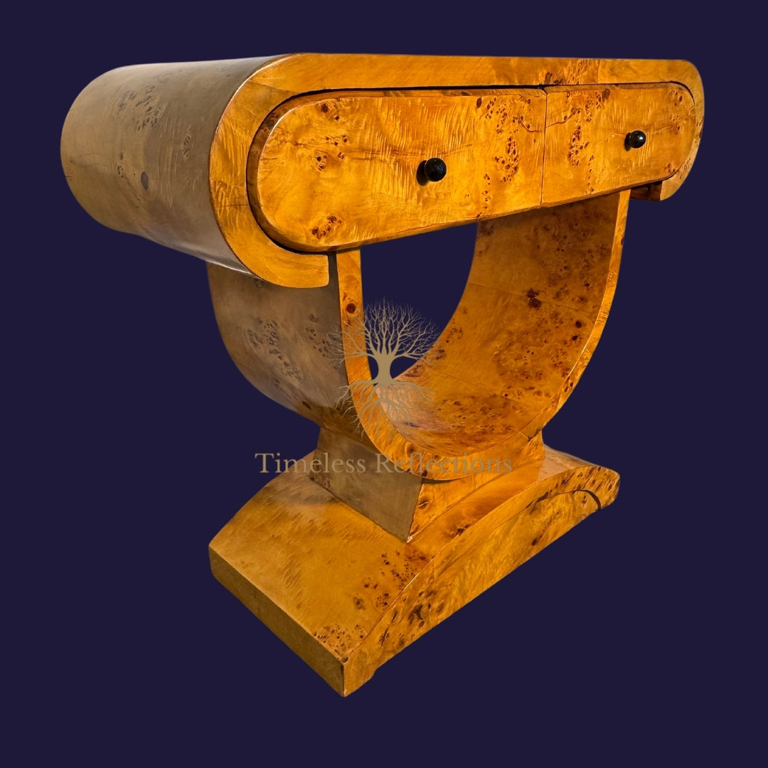 The Waldorf Console is a masterclass in luxurious craftsmanship, exuding a sense of both grandeur and sophistication. With its distinctive curved frame and rich burl veneer, this piece seamlessly blends artistry with function. The dual drawers offer a discreet storage solution, while the robust arched base provides stability. Whether placed in an entryway or living space, this console will make a striking statement, elevating the ambience of any room with its timeless design and rich texture. Perfect for those who appreciate elegance in the everyday.