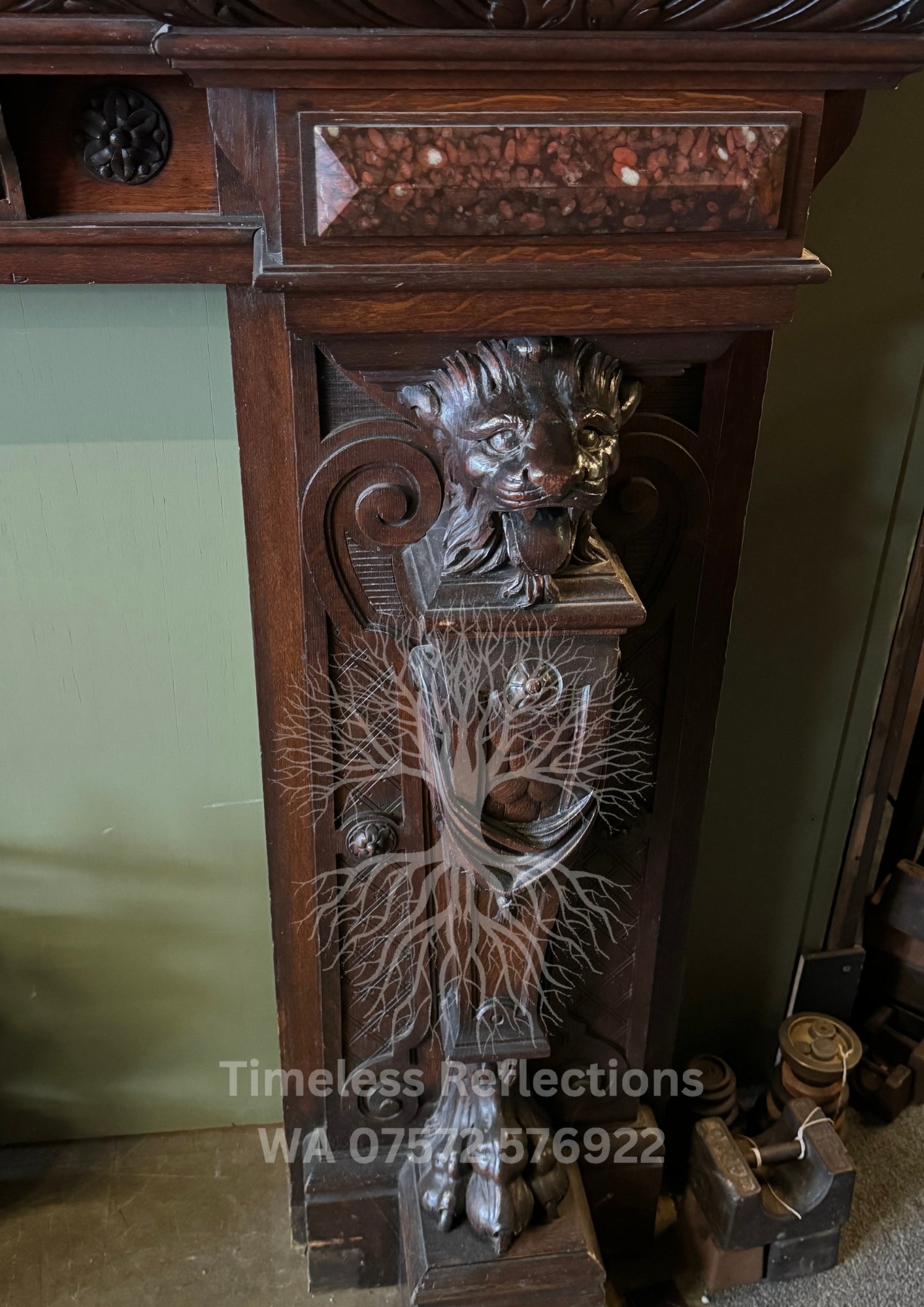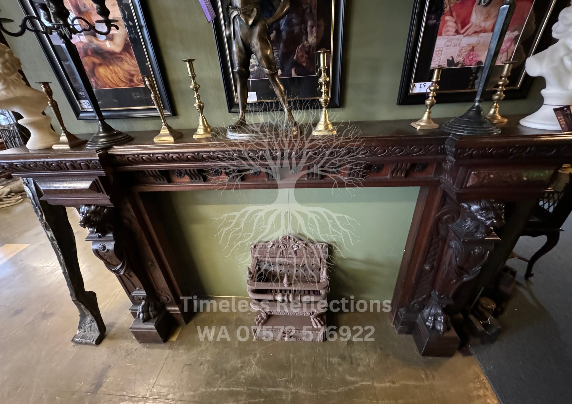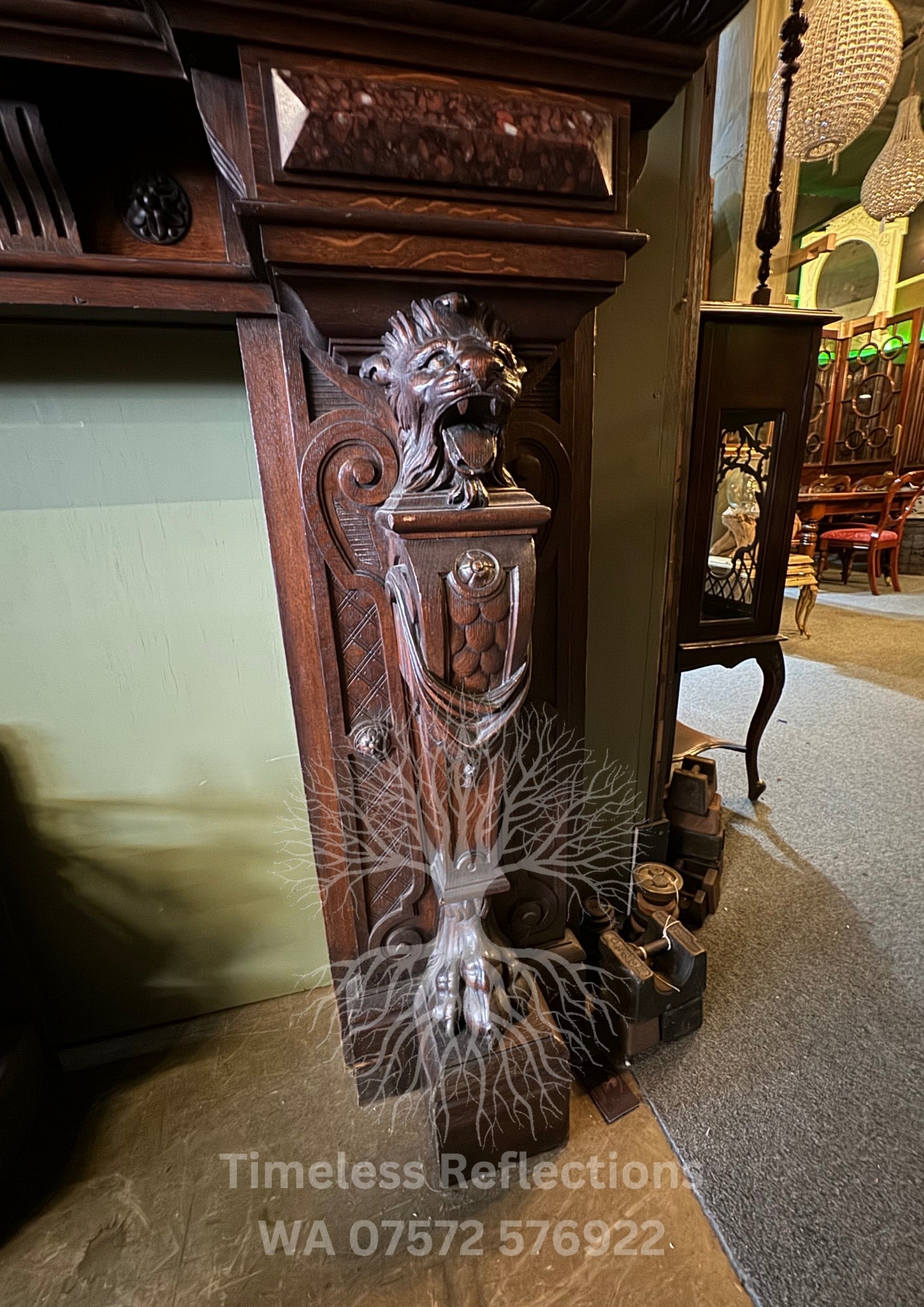 Step into an era of grandeur with this Victorian Lion-Head Mahogany Fireplace, an extraordinary piece that embodies the opulence of classic design. This statement mantle features intricate mahogany carvings, with bold lion heads anchoring each side of the fireplace, evoking strength and elegance. The lions, meticulously crafted with expressive detail, are complemented by rich scrollwork and a carefully carved cornice, making this fireplace a focal point of any room.