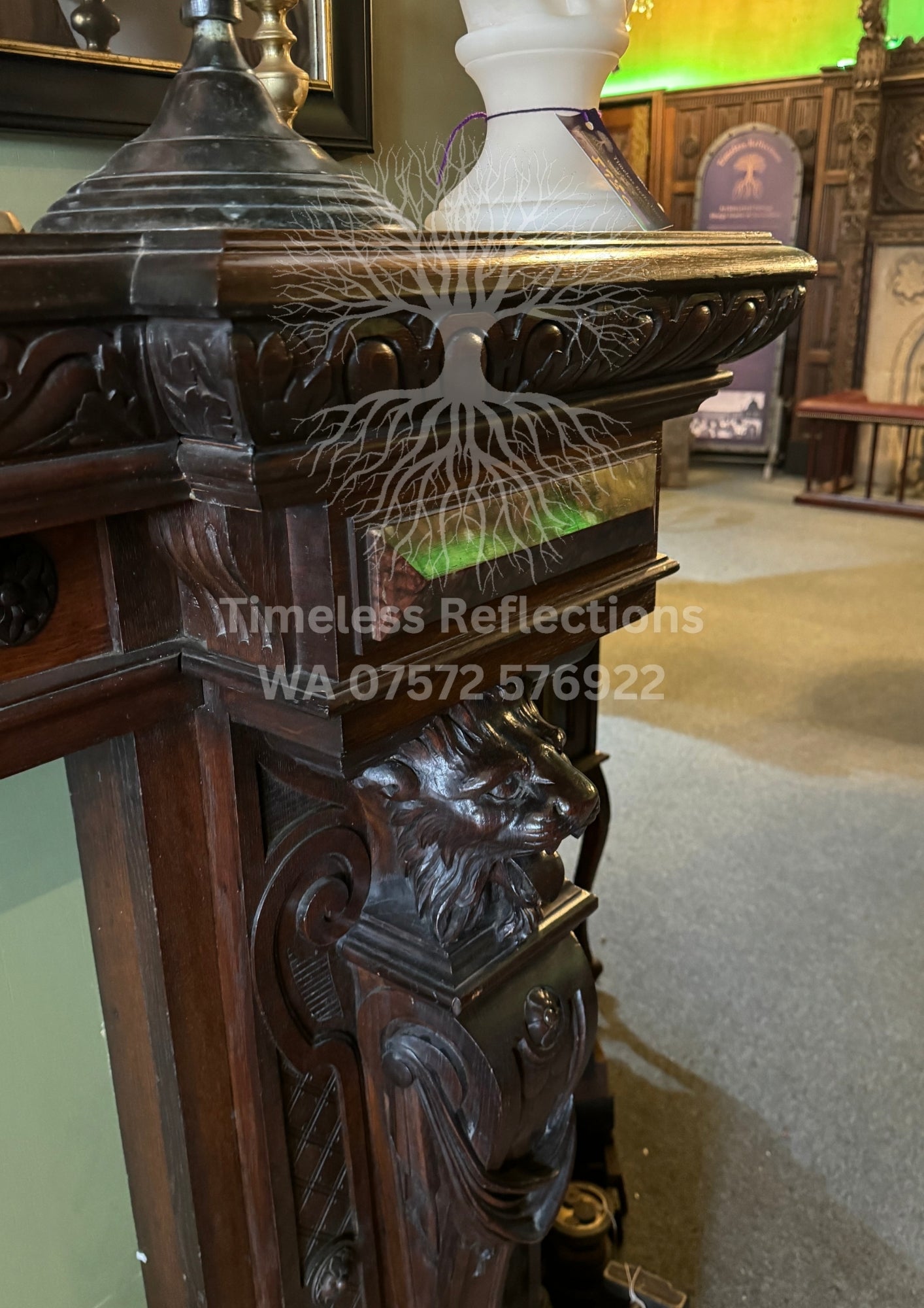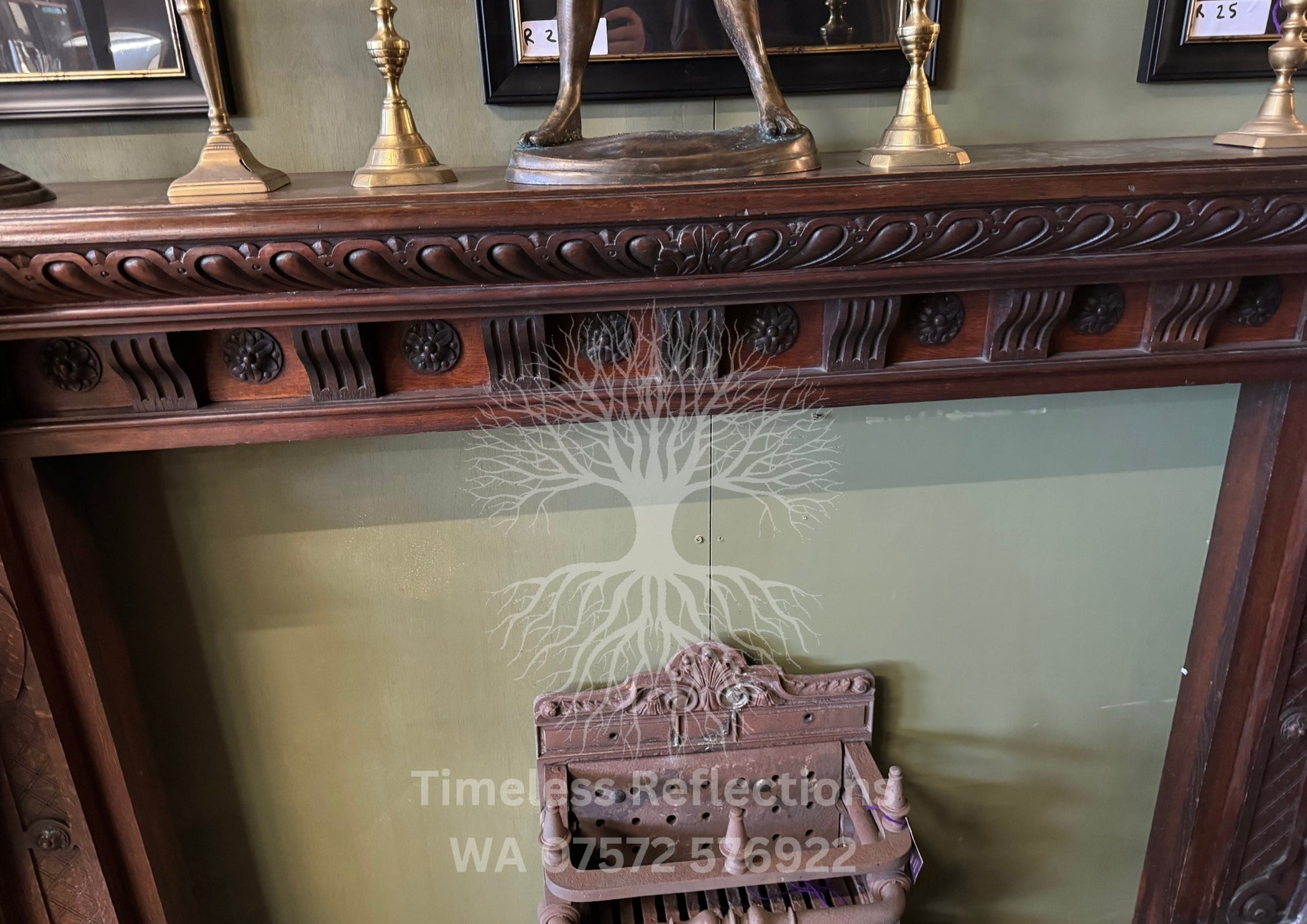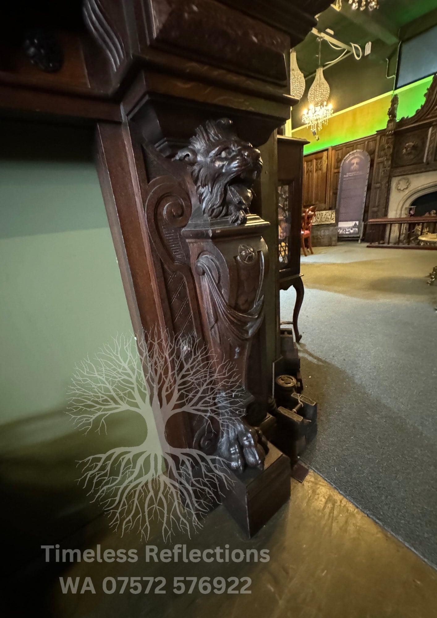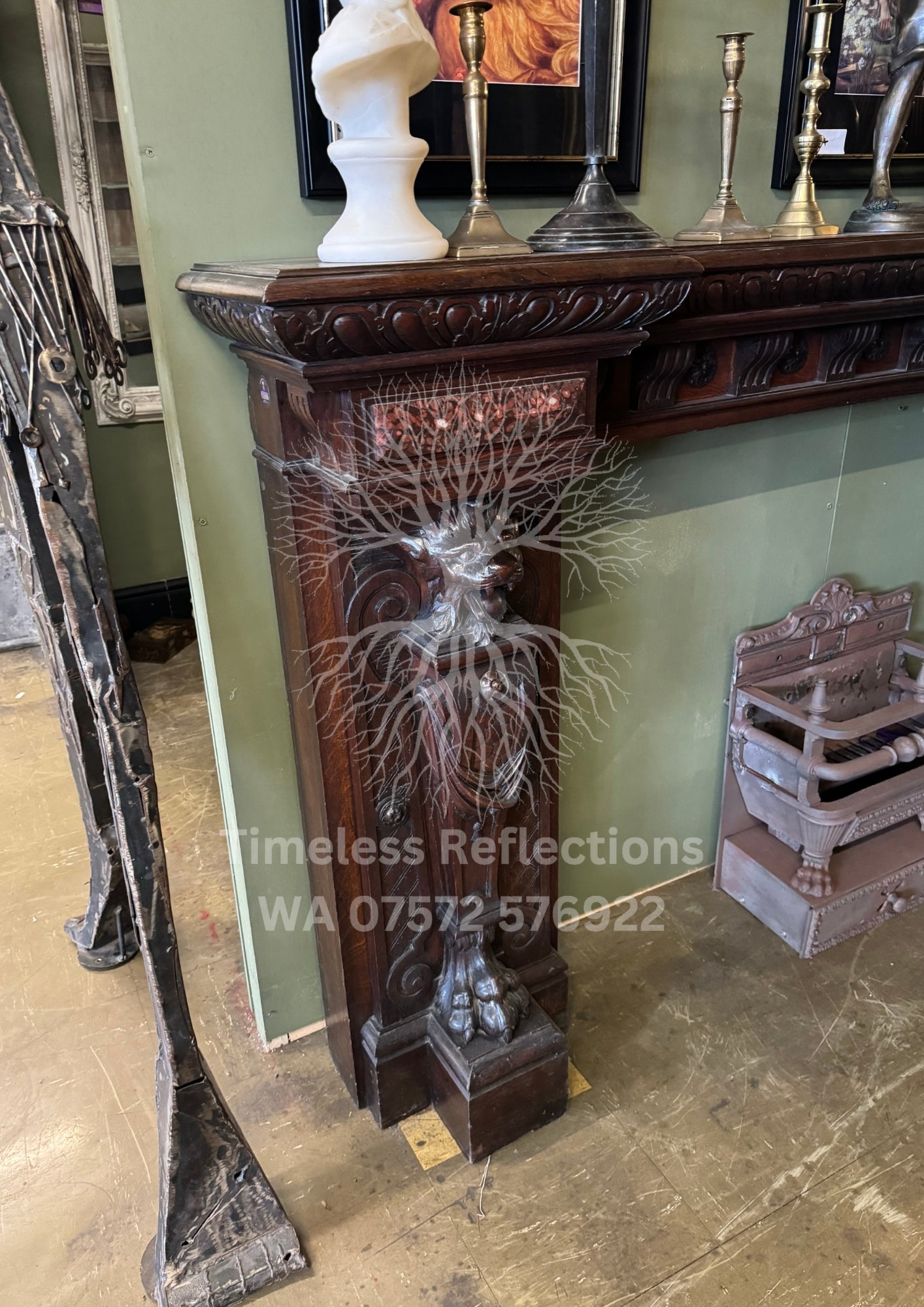 Step into an era of grandeur with this Victorian Lion-Head Mahogany Fireplace, an extraordinary piece that embodies the opulence of classic design. This statement mantle features intricate mahogany carvings, with bold lion heads anchoring each side of the fireplace, evoking strength and elegance. The lions, meticulously crafted with expressive detail, are complemented by rich scrollwork and a carefully carved cornice, making this fireplace a focal point of any room.